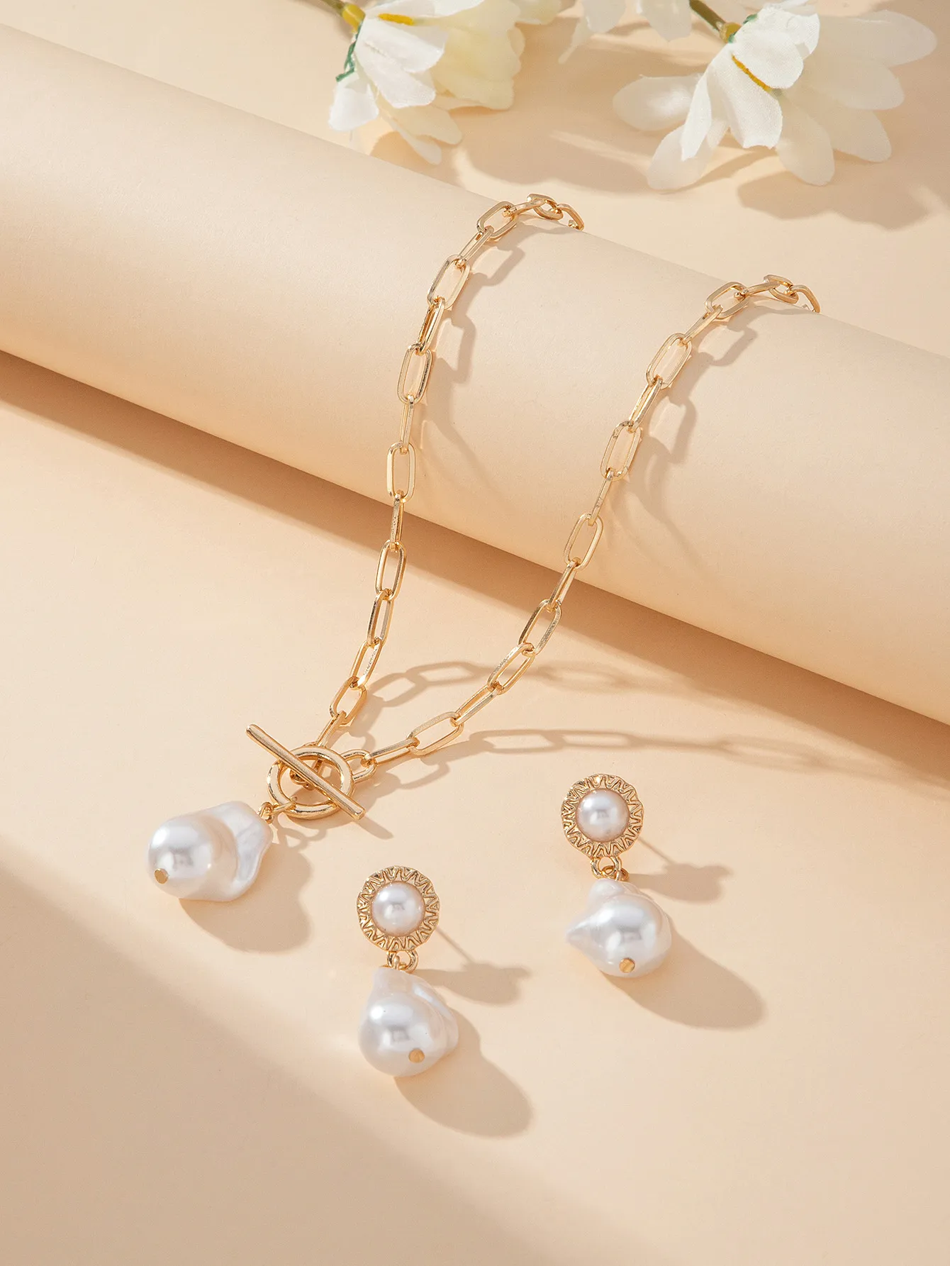 Retro Baroque Pearl Pendant Necklace Ear Stud 2-piece Set