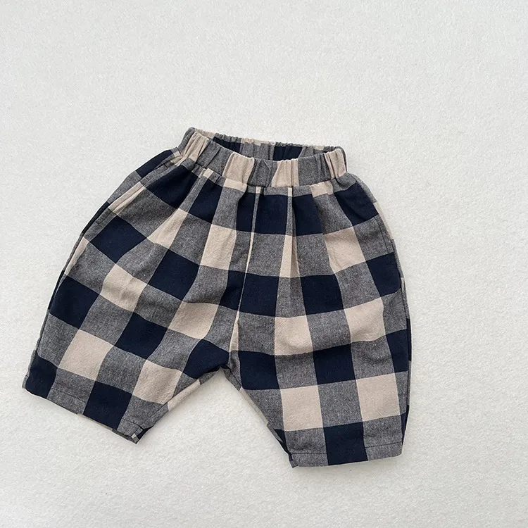 Retro Blue Plaid Casual Capri Pants Children's Middle Pants