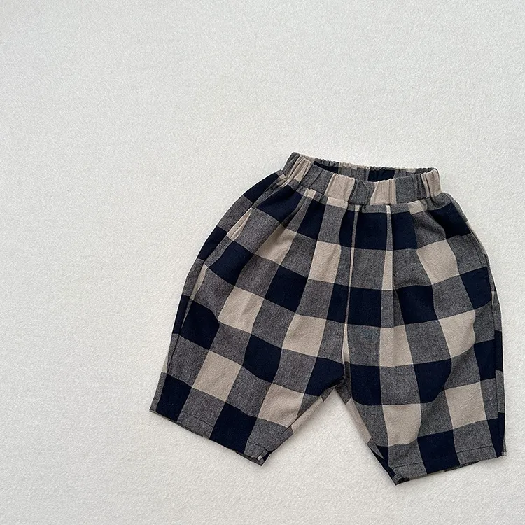 Retro Blue Plaid Casual Capri Pants Children's Middle Pants