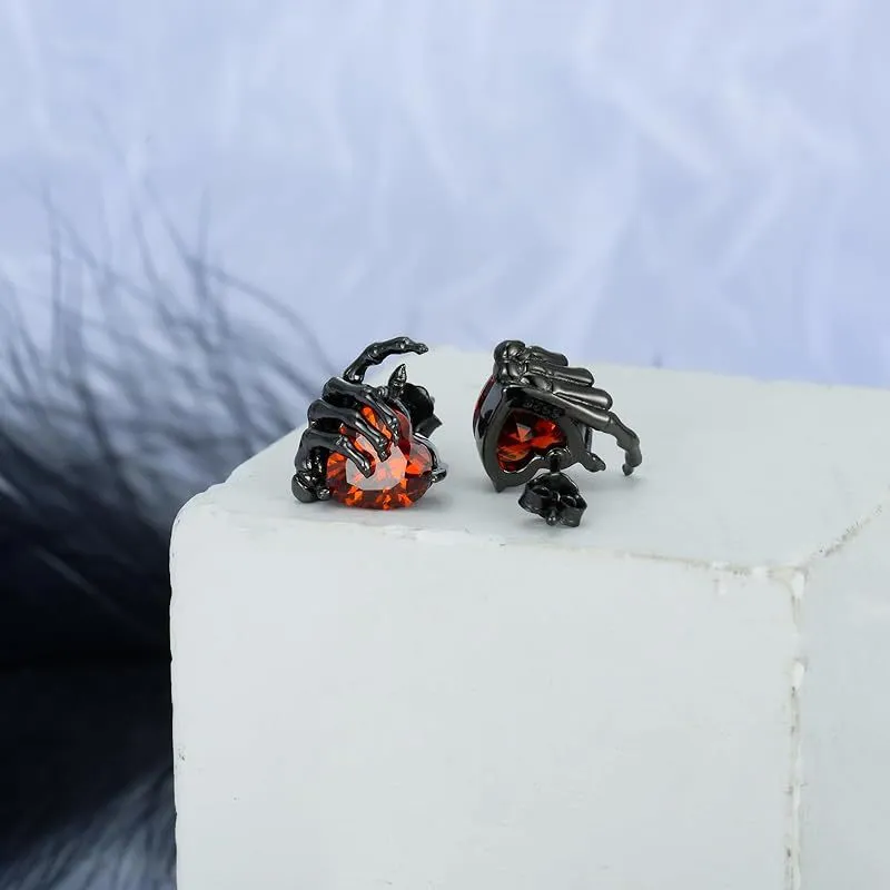 Retro Dark Series Ghost Hand Heart Shape With Diamond Ear Studs