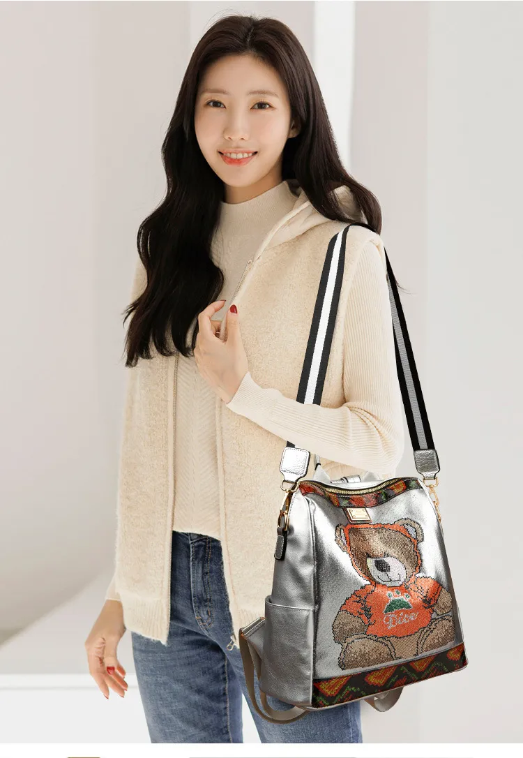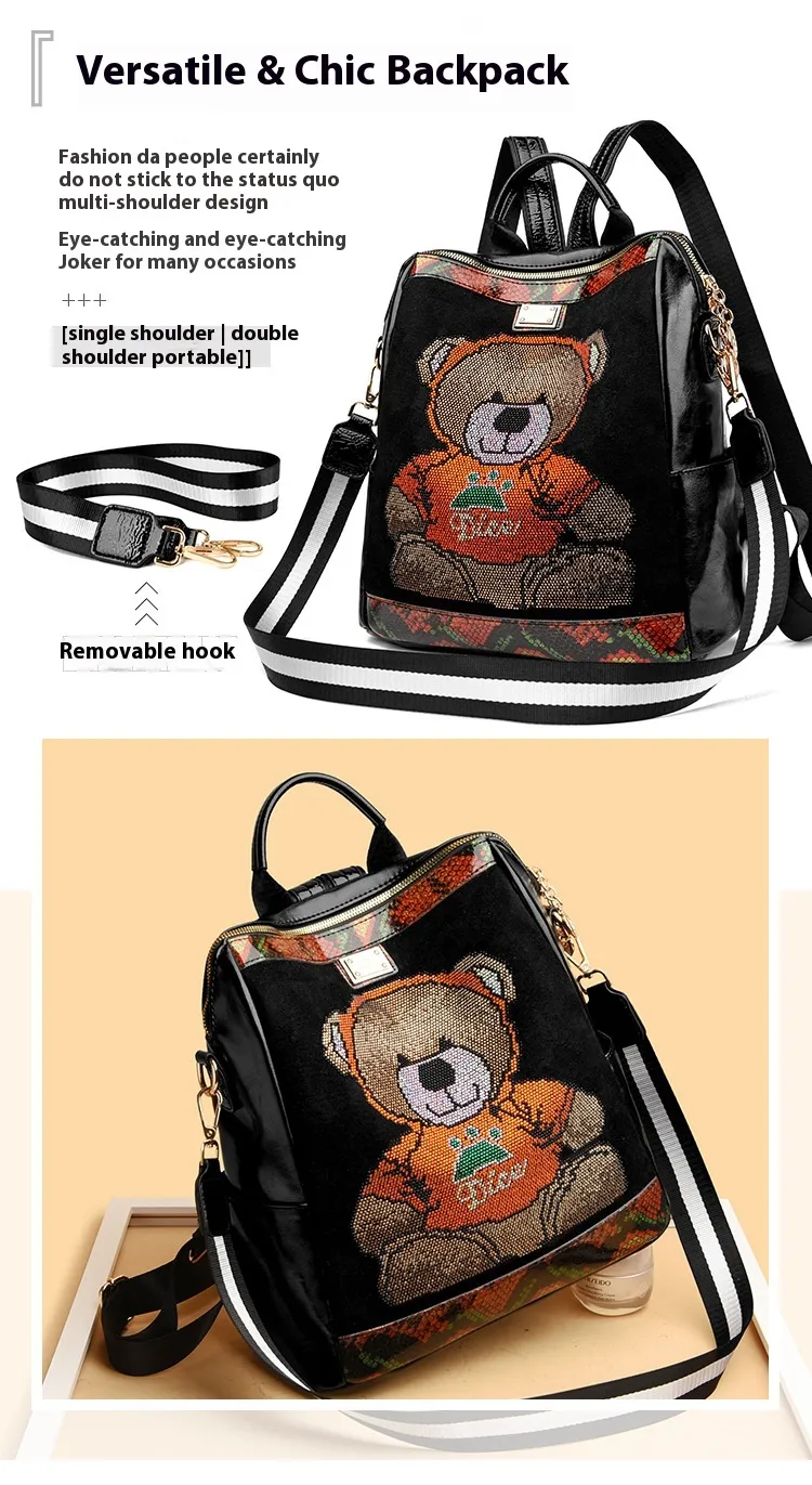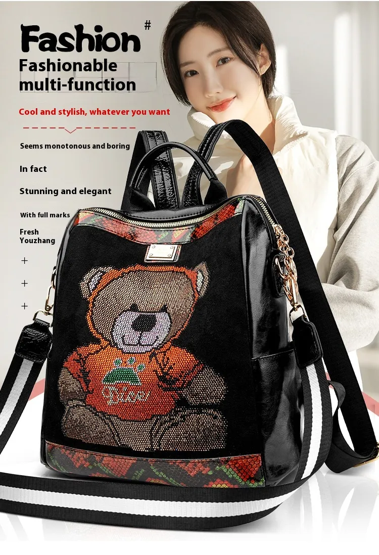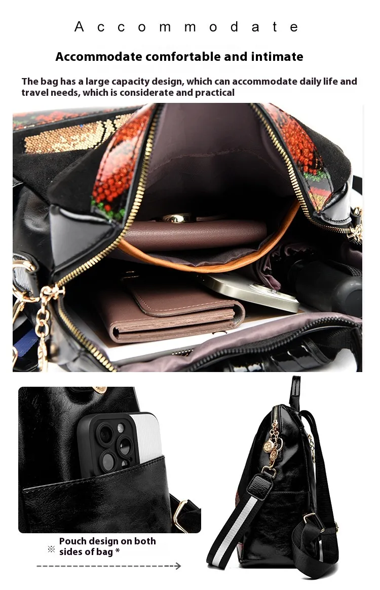 embellishments with a spacious interior, this backpack offers both glamour and functionality. Perfect for daily use, travel, or special