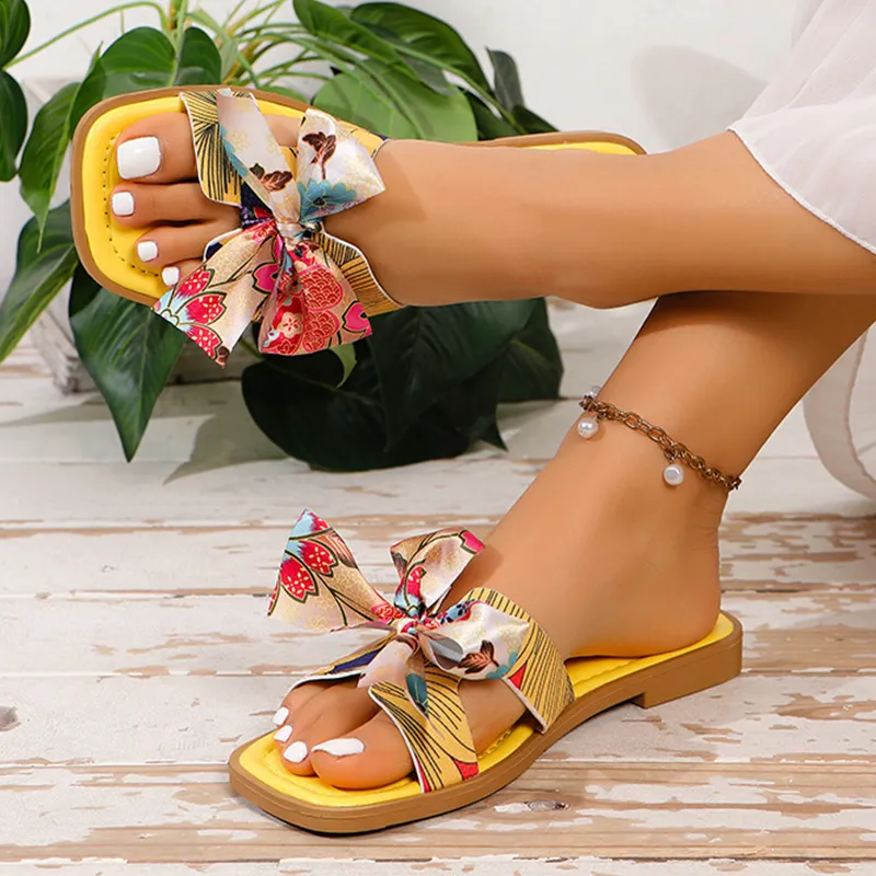 Ribbon Bow Sandals Summer New Square Toe Low Heel Sandal For Women Slides Fashion Casual Beach Shoes