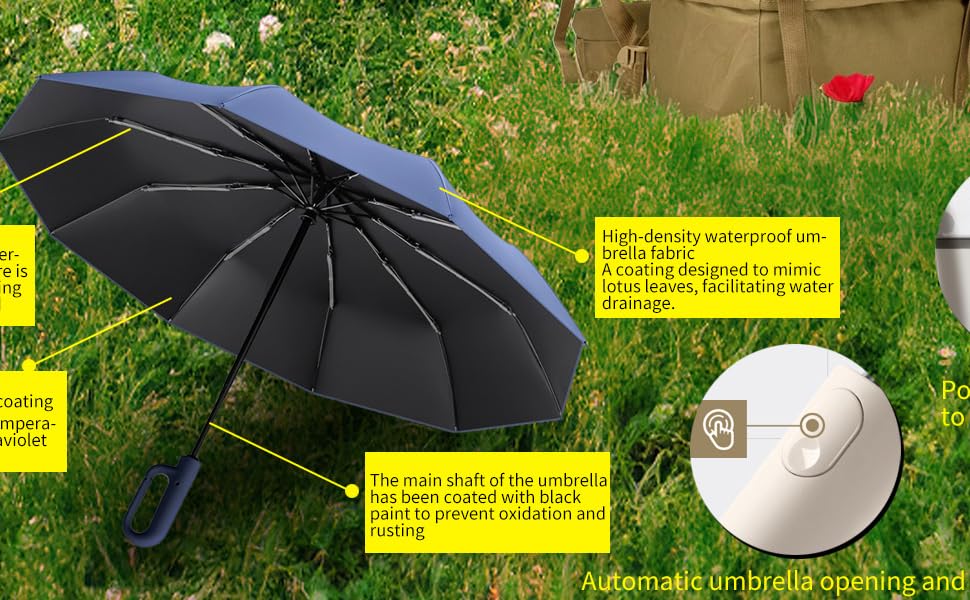 The shaft are made of the premium metal materials, which is light, robust and does not rust, making the ribs of the umbrella resistant to bending and resisting strong winds. The ribs, made from a fibreglass material, is wind-resistant that is difficult to be damaged even when folded 180 degrees.