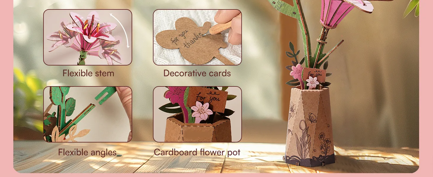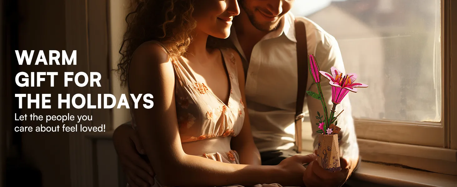The ROBOTIME 3D Puzzle Flowers Wooden Model Kit makes a thoughtful and unique gift for women, men, or teens. Whether it’s for birthdays, holidays, Mother’s Day, Valentine's Day, or just a special surprise, this DIY flower kit offers an interactive and meaningful gift that adds a personal touch. The recipient can enjoy the process of building the flowers, and once completed, the bouquet can be proudly displayed in their home or office as a lasting keepsake.