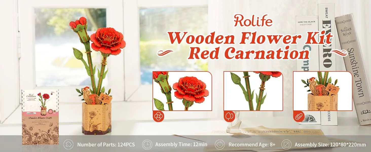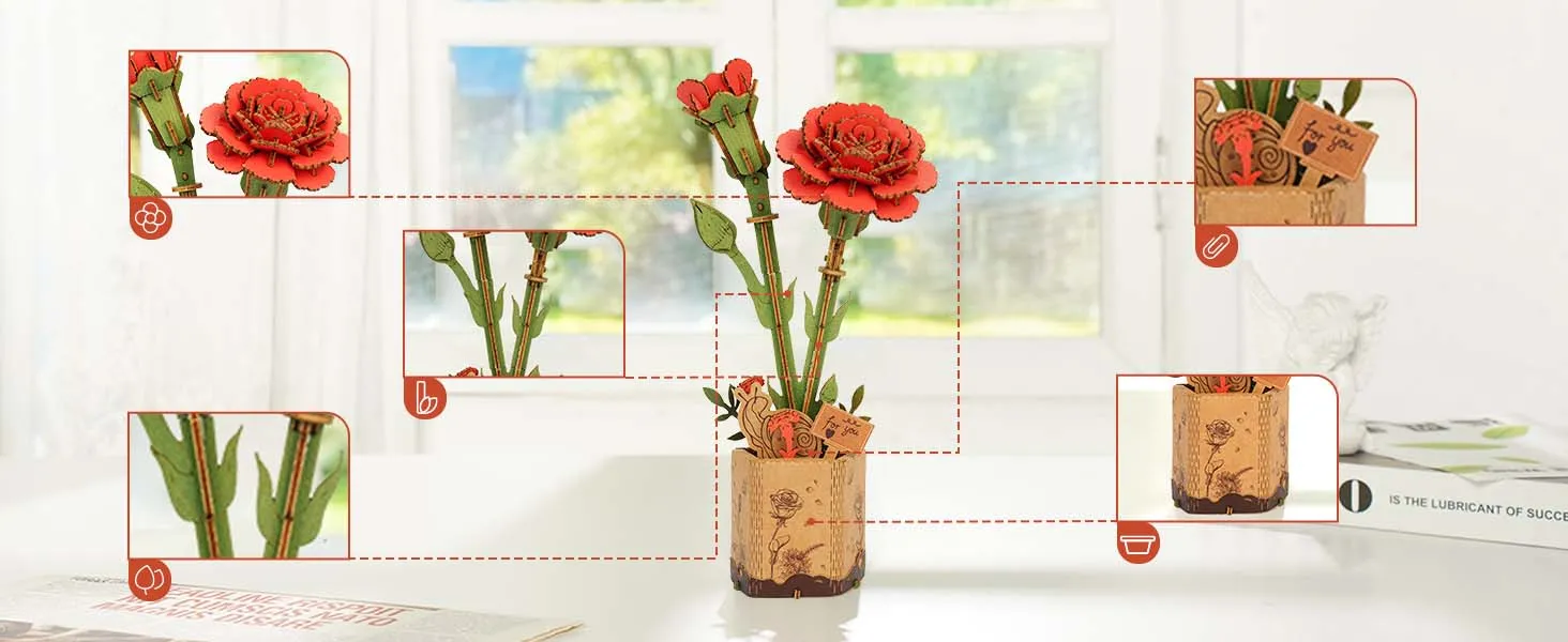 The ROlife 3D Puzzle Flowers Bouquet Wooden Craft Model Kit offers an exceptional opportunity to create a timeless piece of art. This DIY kit allows you to craft your own red carnation bouquet using high-quality wooden pieces, making it the perfect gift for any occasion. Whether it's Valentine's Day, Mother's Day, a birthday, or just a thoughtful gesture, this eternal flowers bouquet is an elegant and romantic way to show you care. Designed for adults and teens alike, this puzzle kit combines creativity, craftsmanship, and heartfelt sentiment, allowing the recipient to enjoy a beautiful handmade gift that lasts forever.