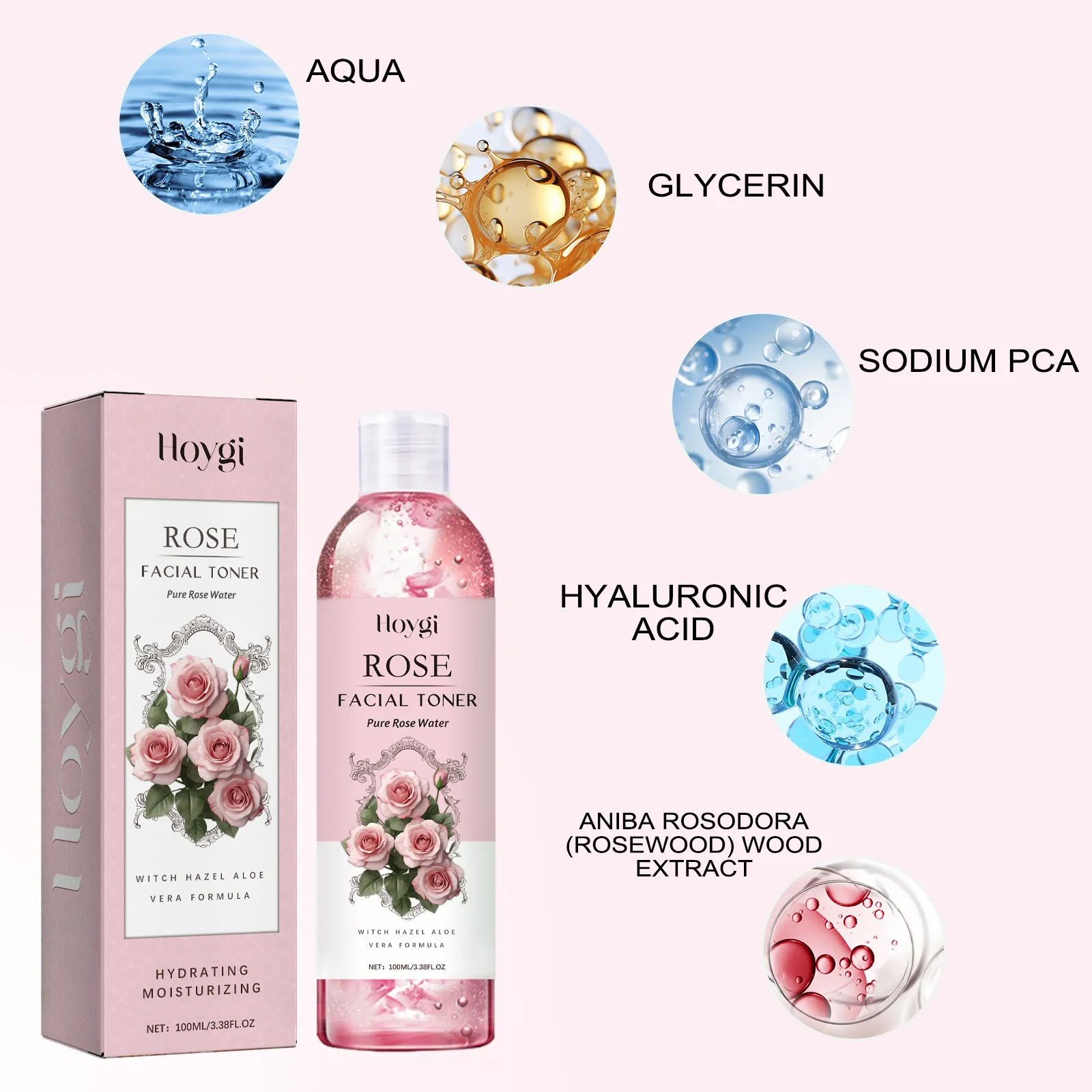 Ingredients: Water, glycerin, hyaluronic acid, sodium PCA, rosewood extract