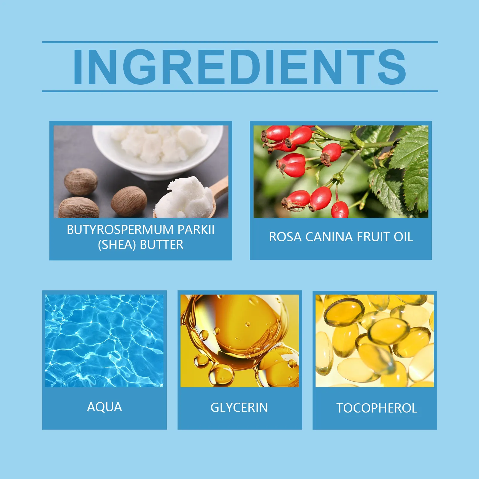 Ingredients: Water, shea butter, vitamin E, glycerin, rose hip oil