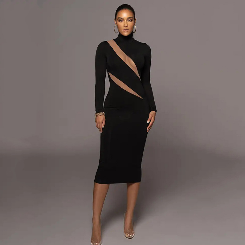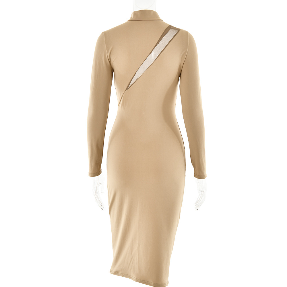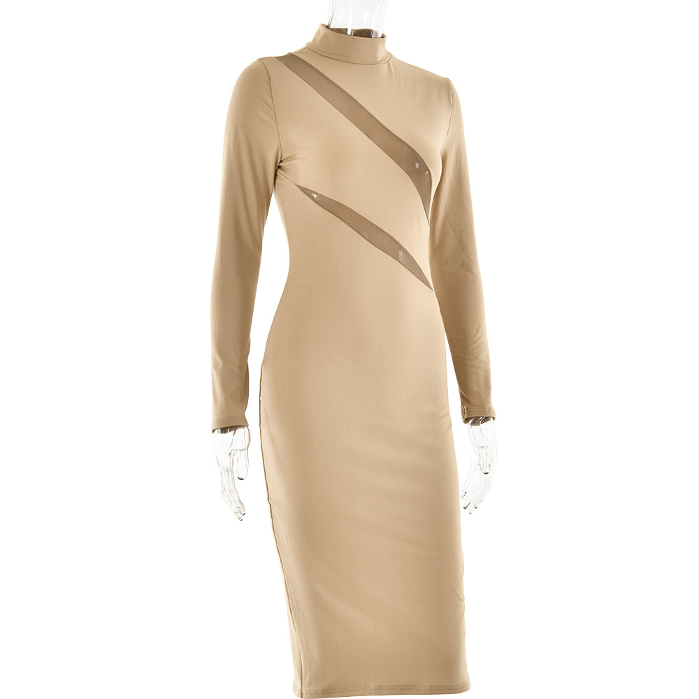 The dress features a round neckline that provides a classic and timeless look, perfect for those who appreciate subtle elegance. The long sleeves offer coverage and warmth, making it ideal for cooler seasons like fall and winter. The stitching details add a touch of sophistication, elevating the overall design and giving it a unique edge.
