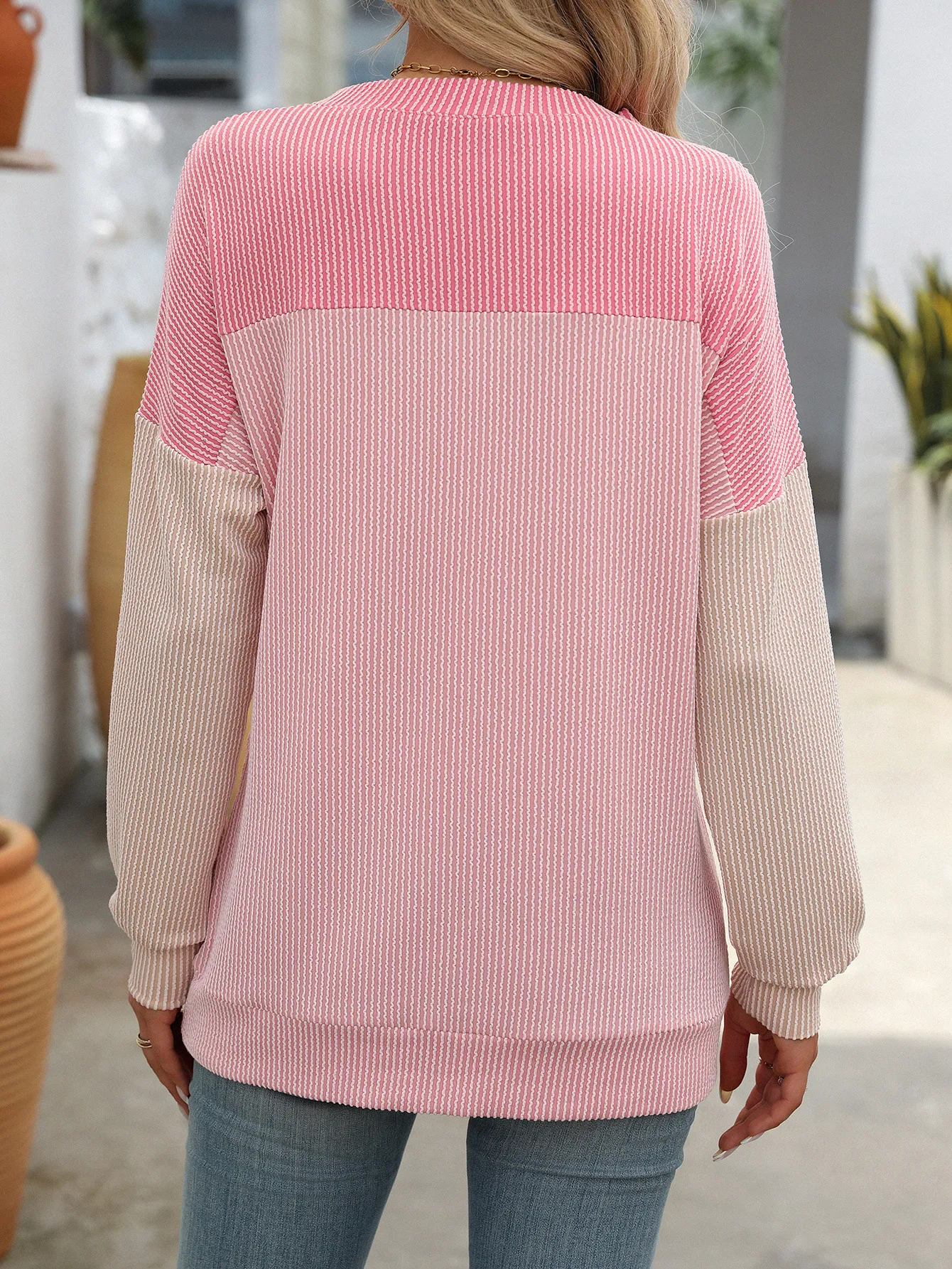 Round Neck Twist Strip Color Matching Long Sleeve Loose T-shirt For Women