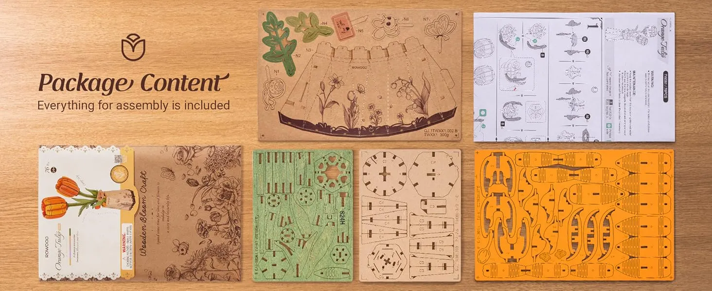 The Rowood 3D Puzzle DIY Wooden Flower Kit comes with all the materials you need to create your flower model, along with easy-to-follow instructions that guide you through each step. The detailed instructions make it simple to assemble the wooden flower model, ensuring that even beginners can enjoy the process without frustration.