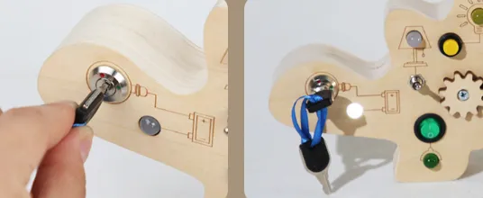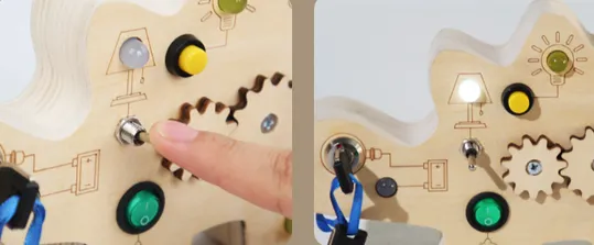 Promotes Fine Motor Skills: Activities like fastening buttons, tying laces, and turning knobs help strengthen hand-eye