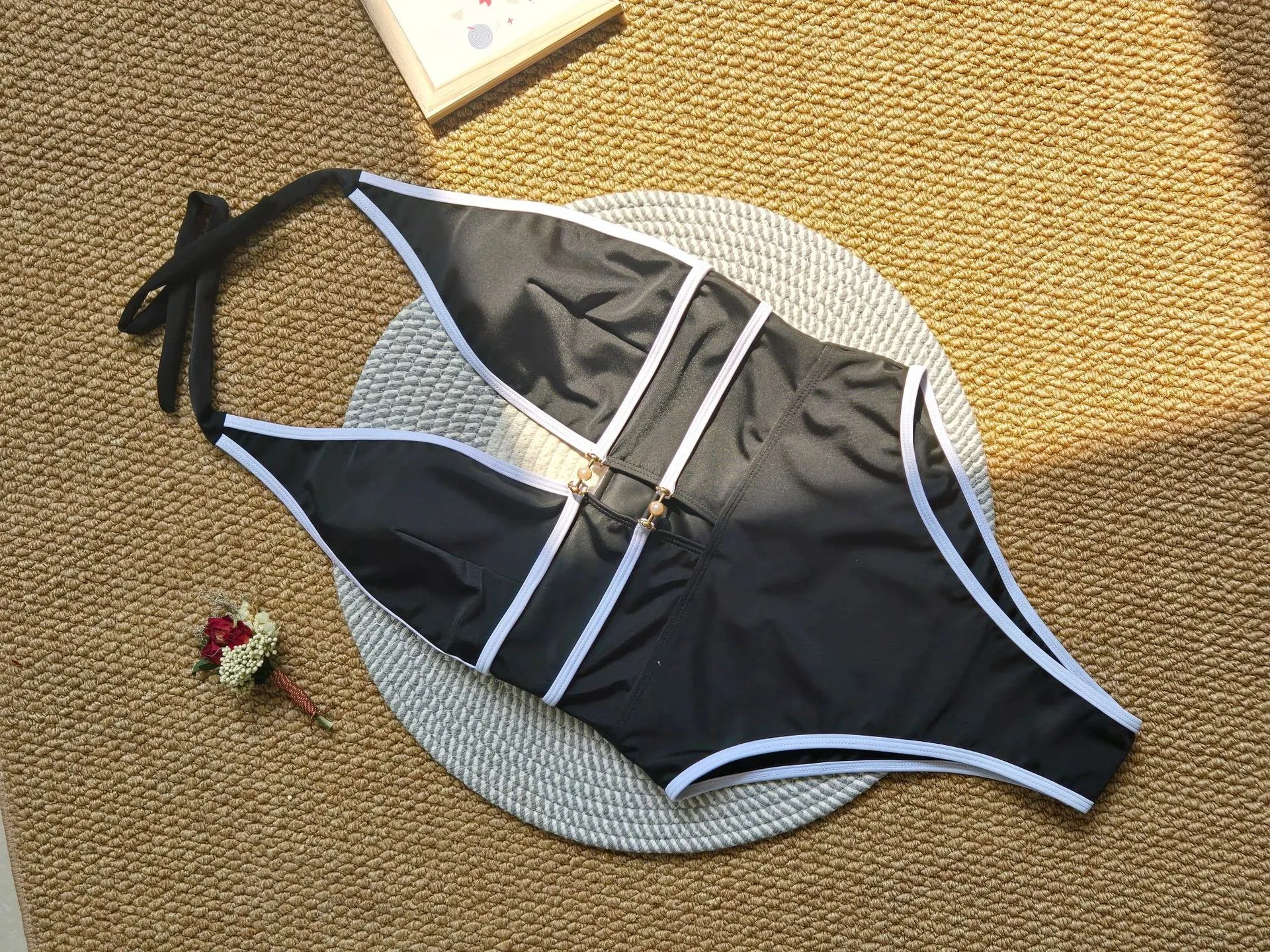Sexy Bikini Jumpsuit Suspender Deep V Black And White Cross Thin Swimsuit