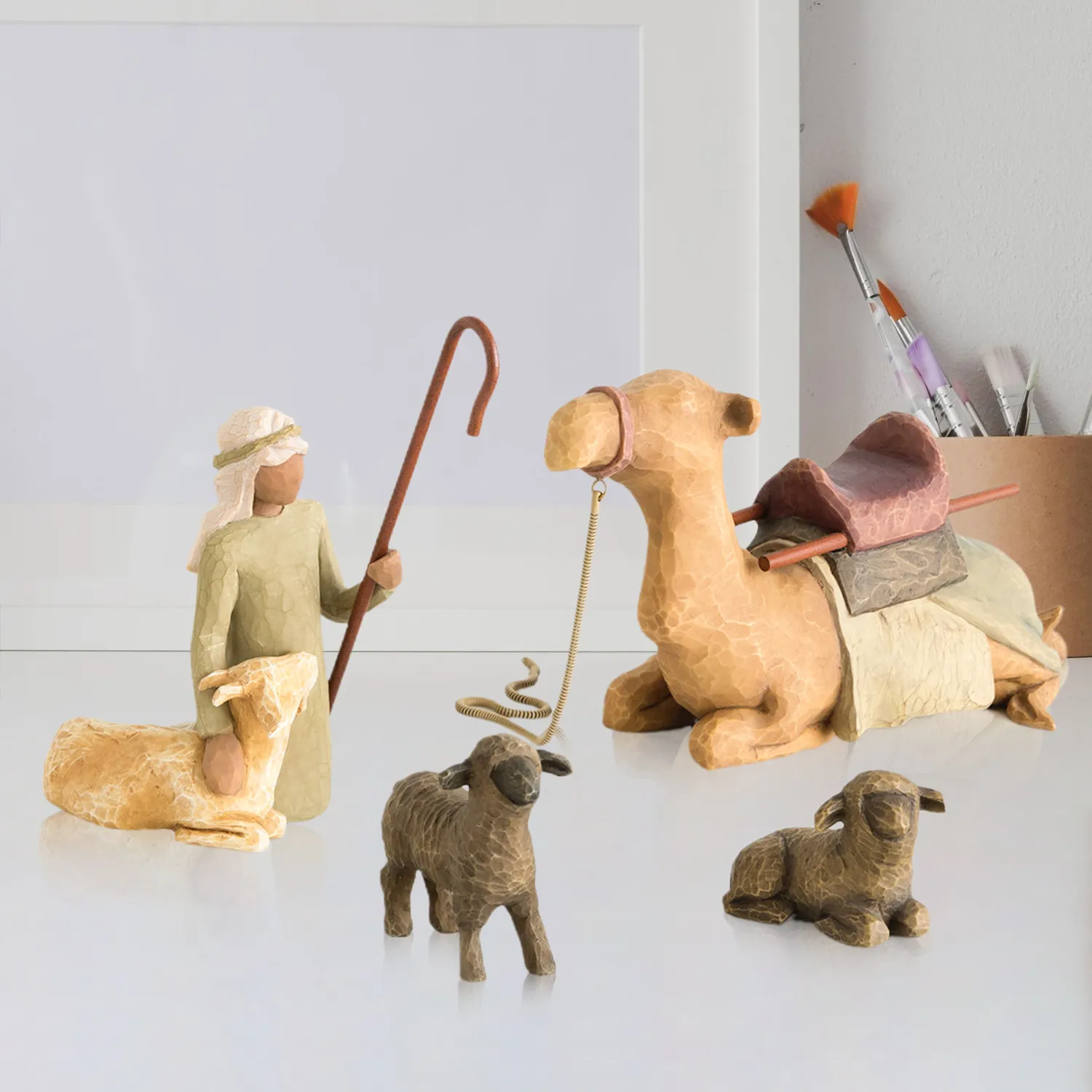 The ornament is designed to be stable on flat surfaces while being easy to handle and arrange in nativity displays.