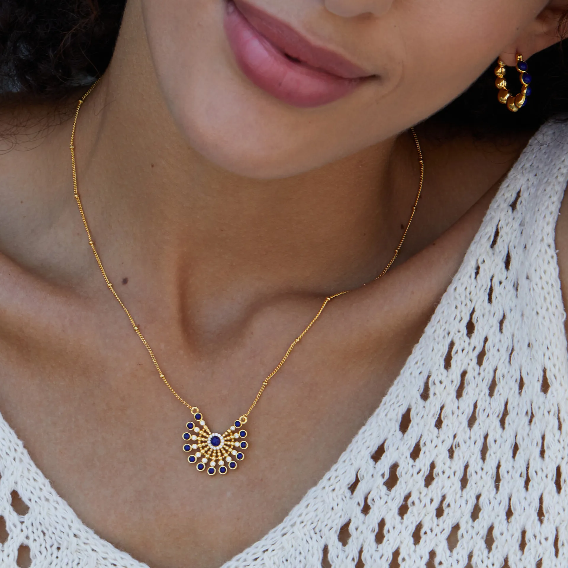 At the heart of this exquisite necklace lies the lapis lazuli, a semi-precious stone renowned for its deep, vibrant blue color. This gemstone has been prized for centuries and is often associated with wisdom, truth, and spiritual enlightenment.