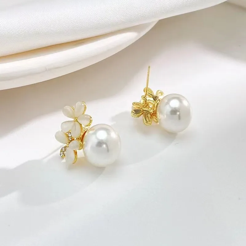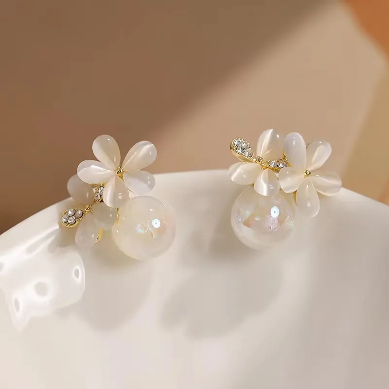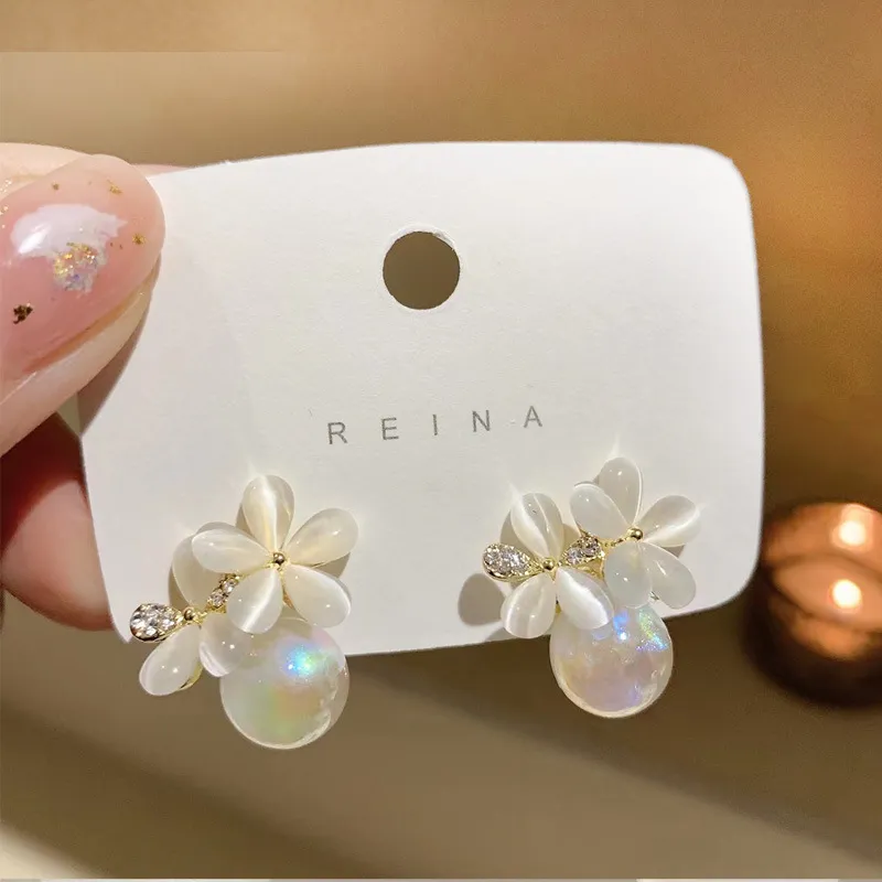 Silver Needle Retro Cymophanite Flower Stud Earrings Mermaid