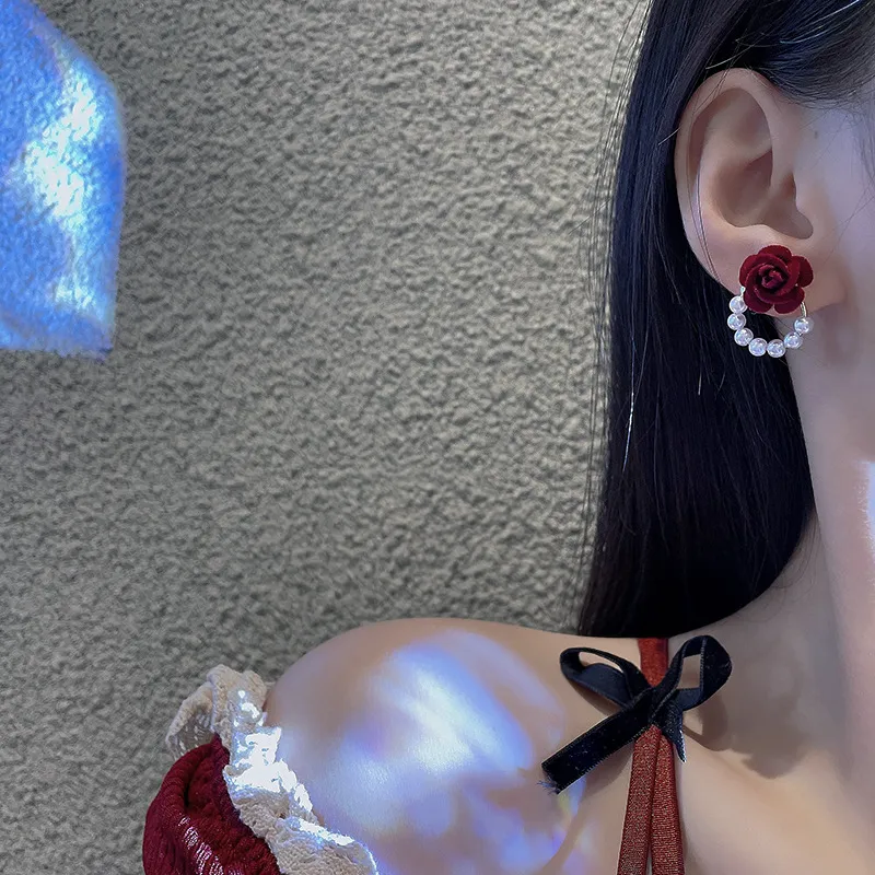 Silver Pin Flocking Wine Red Rose Earrings