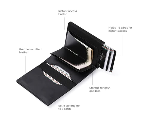 of cash, all while remaining an ultra slim profile that seamlessly fits in your pocket. Our newly designed instant access button allows you