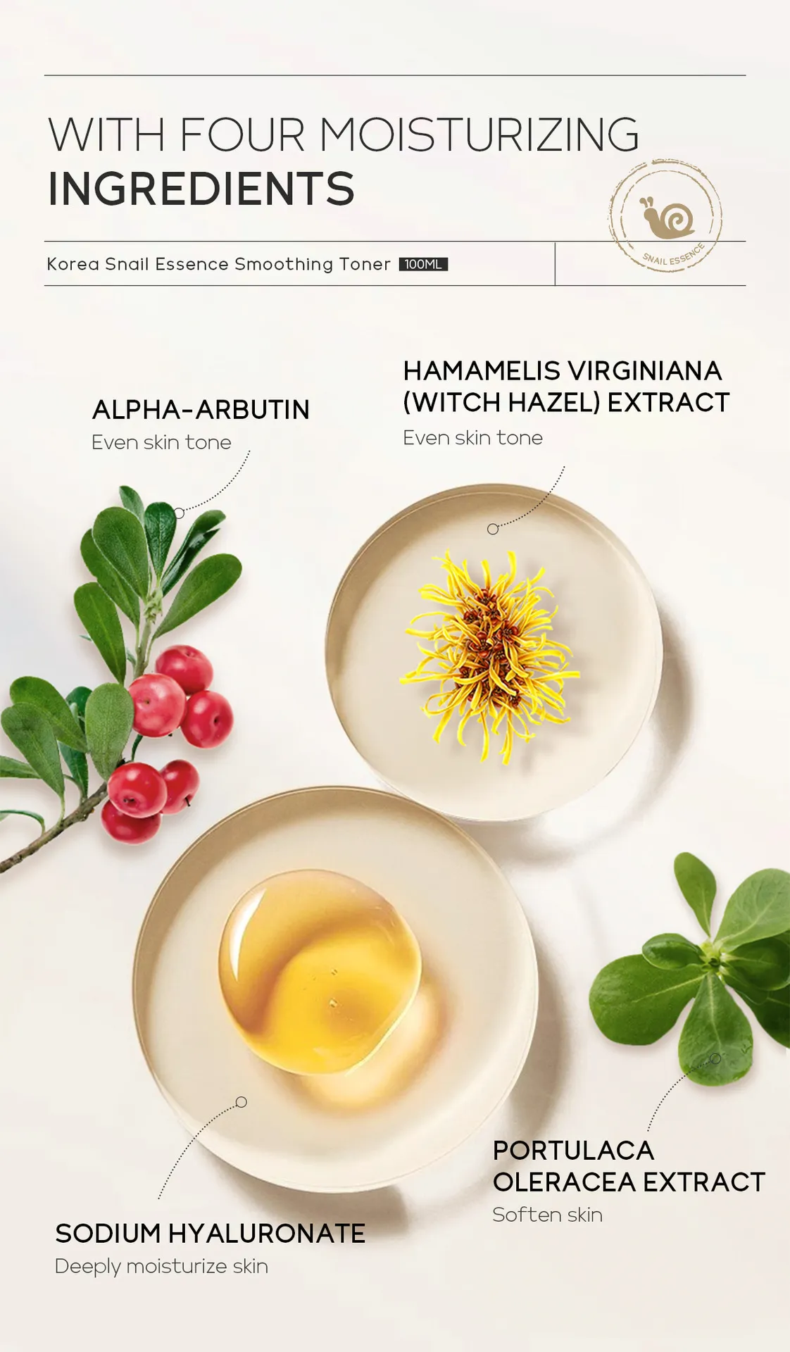 Snail Mucin Extract: Rich in hyaluronic acid, glycolic acid, and proteins, snail mucin helps to repair, hydrate, and