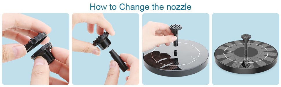 - Six spray patterns: Solar water fountain contains 6 different nozzles, which will produce different spray shapes and spray patterns. The height can be adjusted by replacing the nozzles to avoid splashing out of the basin. The spray height can reach 13.78-25.6 inch. You can easily replace the nozzle.