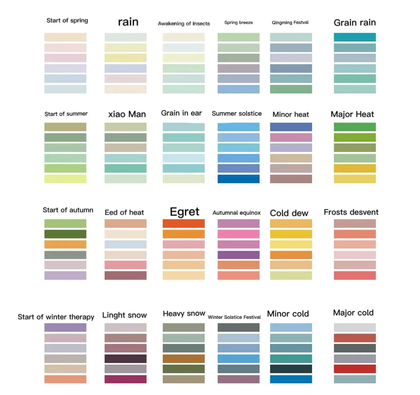 Equinox 17. Cold dew 18. Frost's descent 19. Start of winter 20. Light snow 21. Heavy snow 22. Winter solstice 23 minor cold 24 Major cold