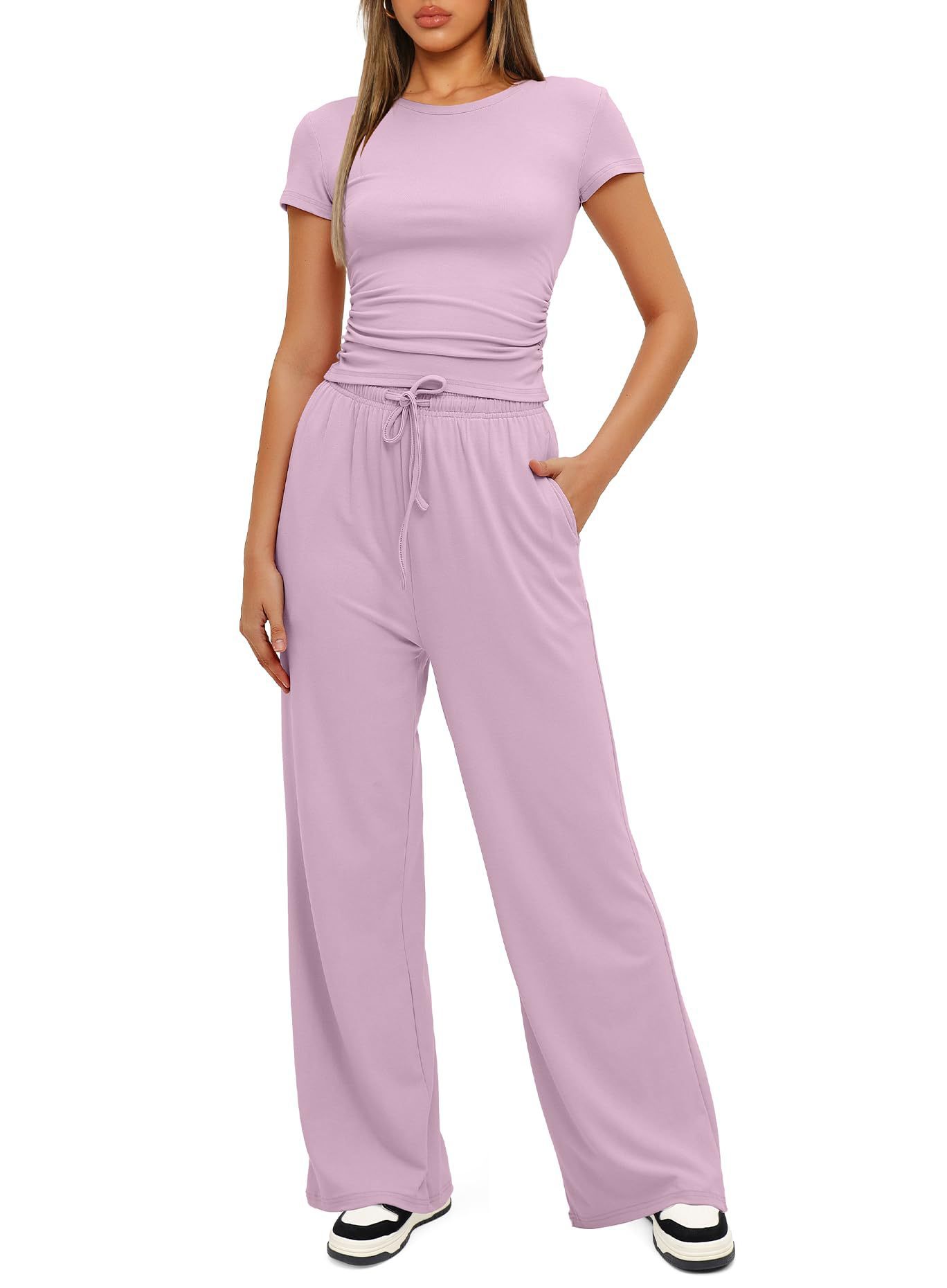 Solid Color Yoga Set: Short-sleeve Top & High-waisted Wide-leg Pants