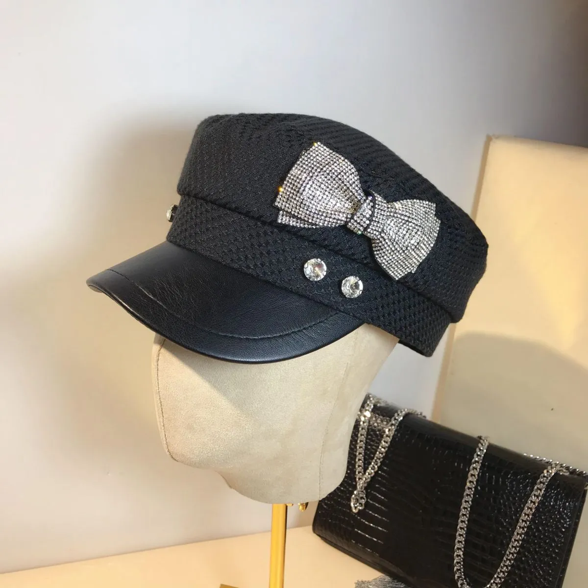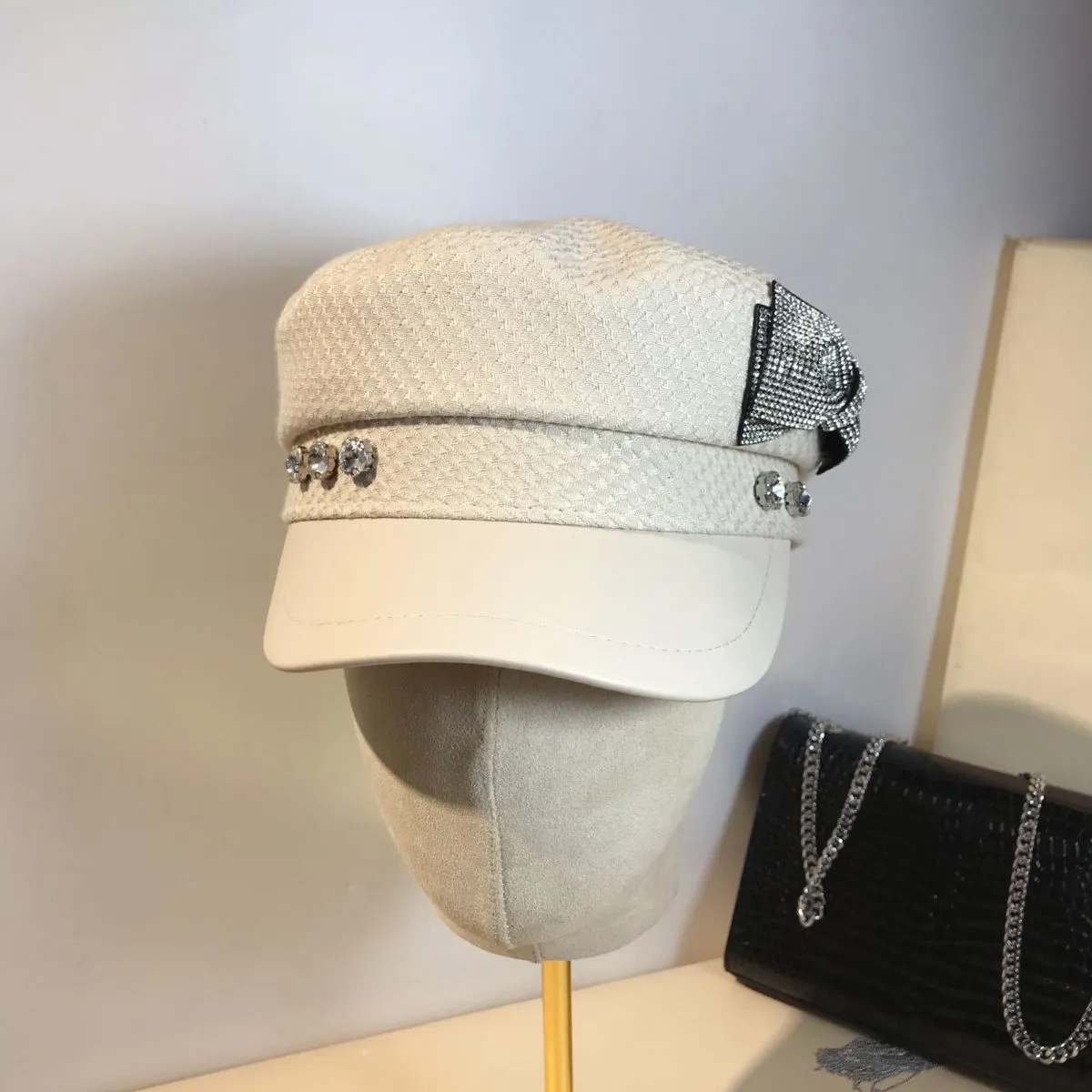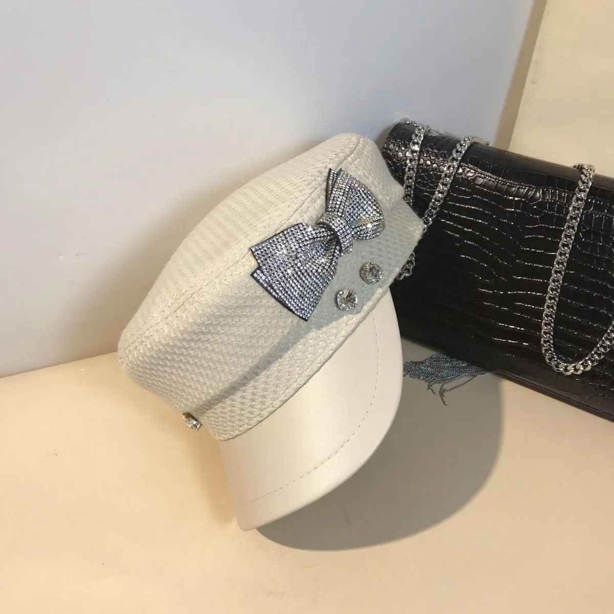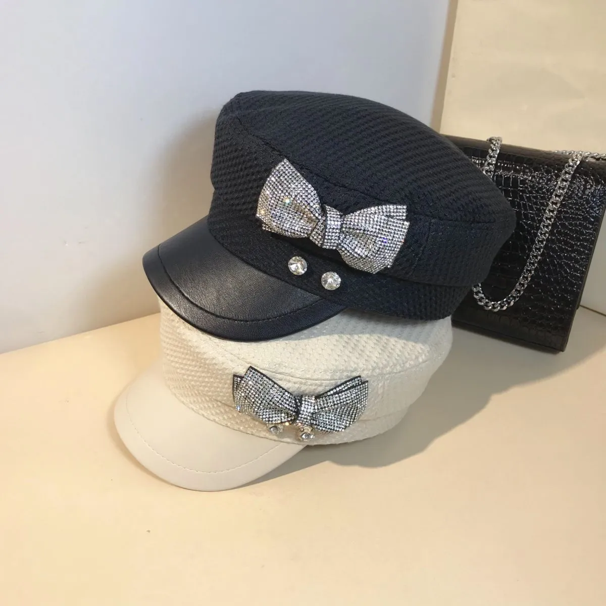 Splicing Socialite Flat Top Rhinestone Bow Navy Hat Female