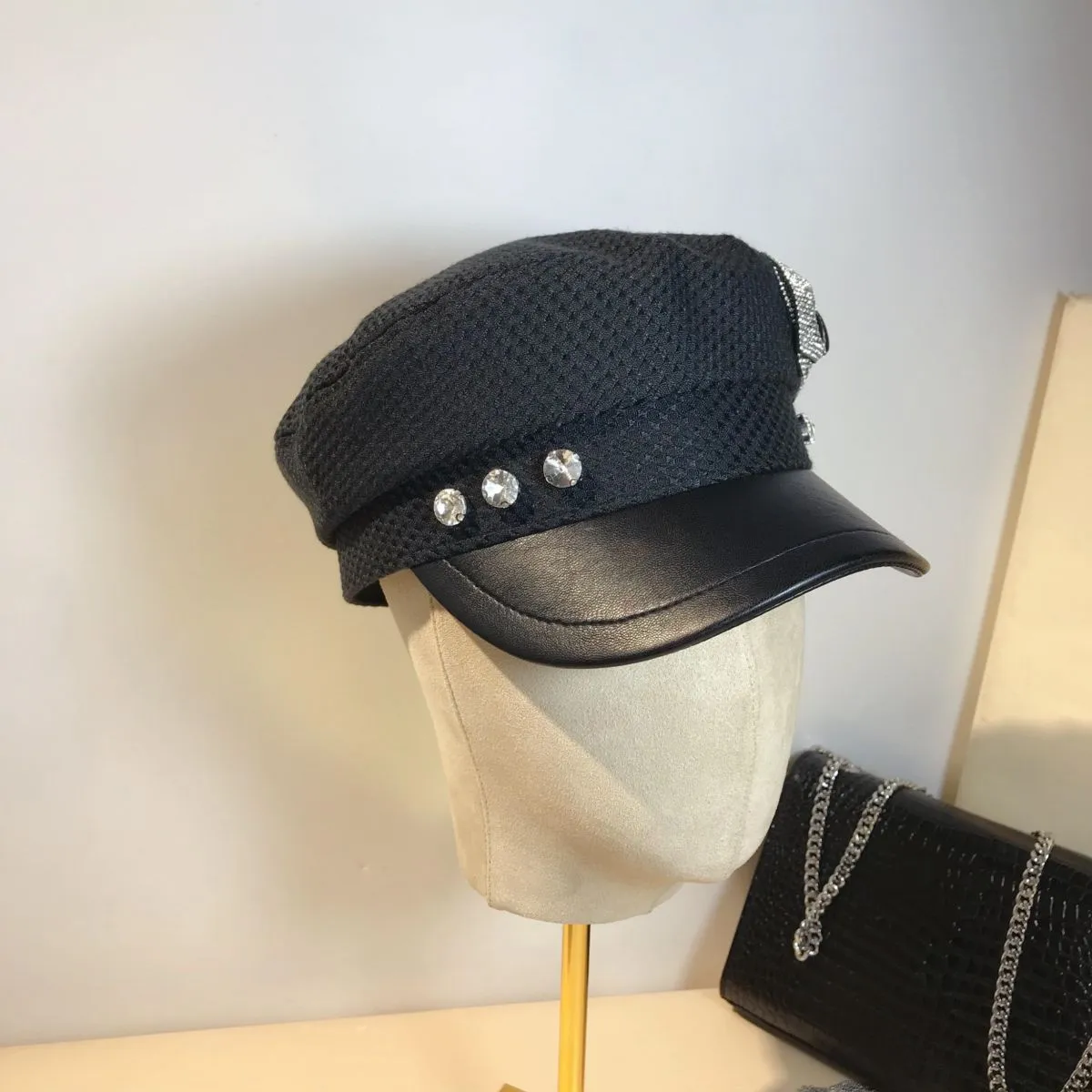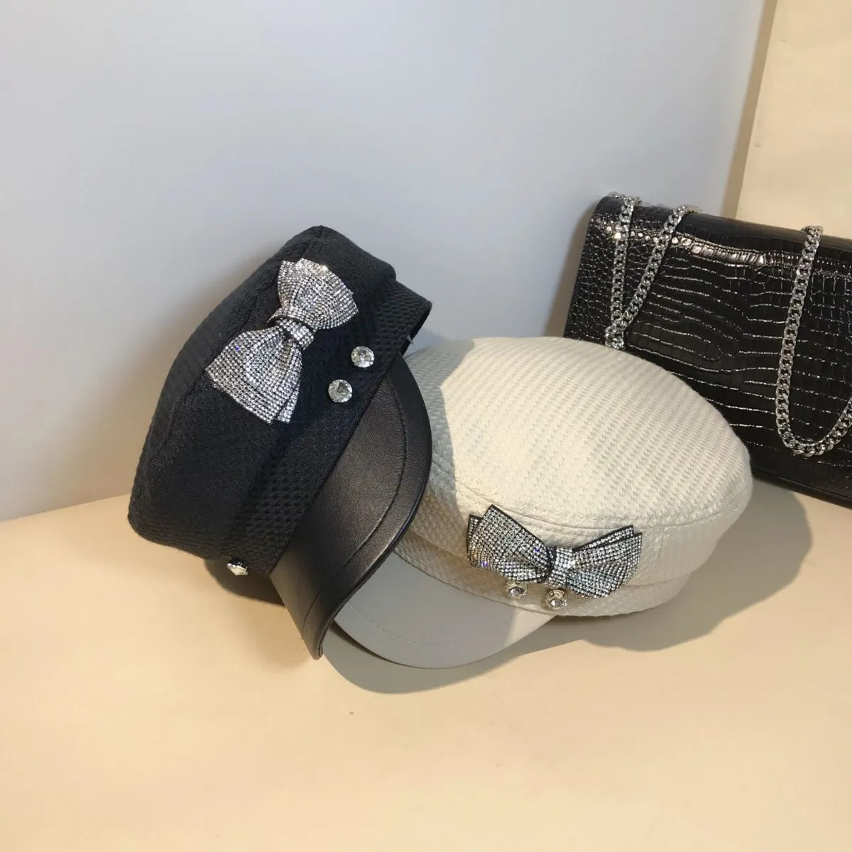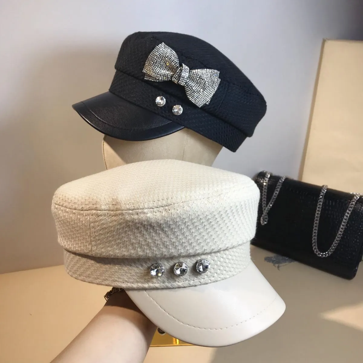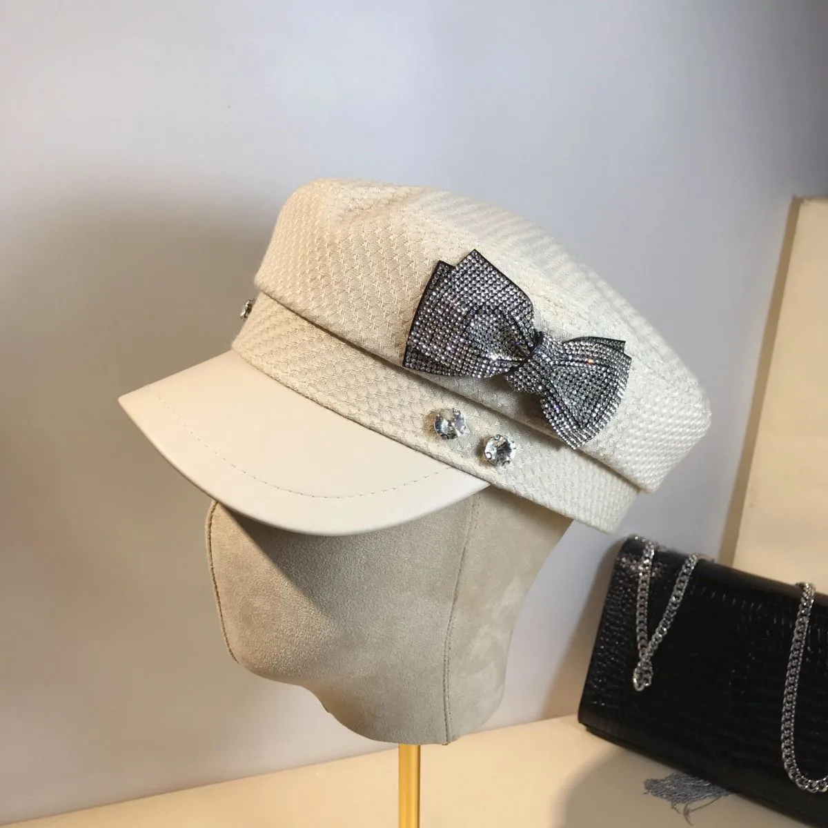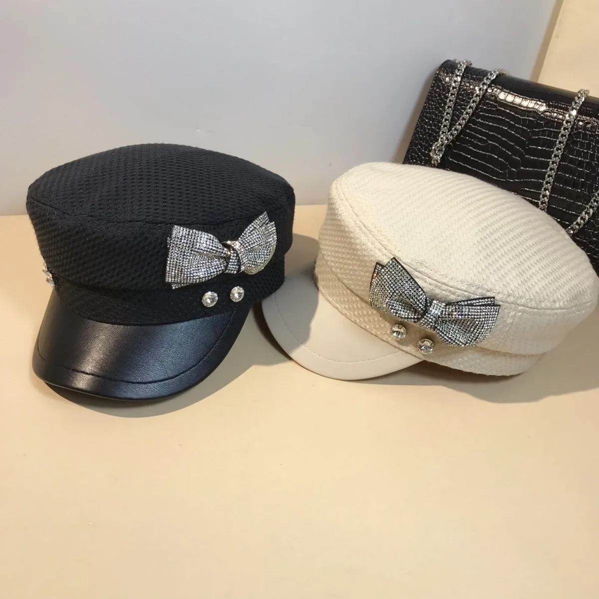 Splicing Socialite Flat Top Rhinestone Bow Navy Hat Female