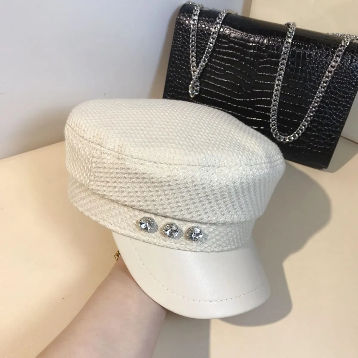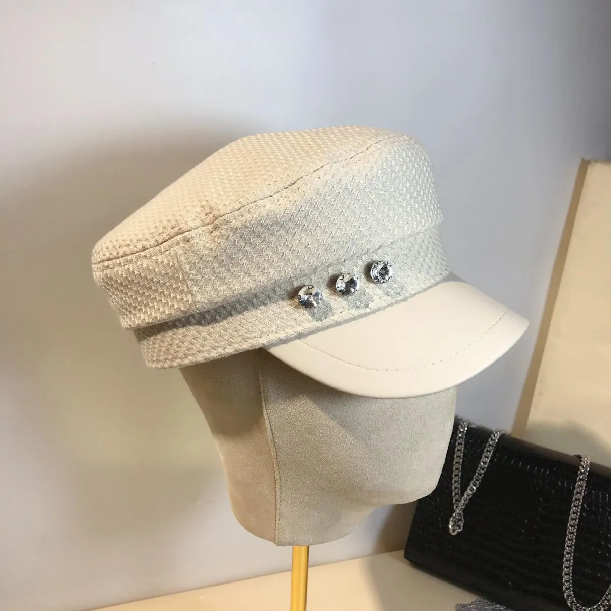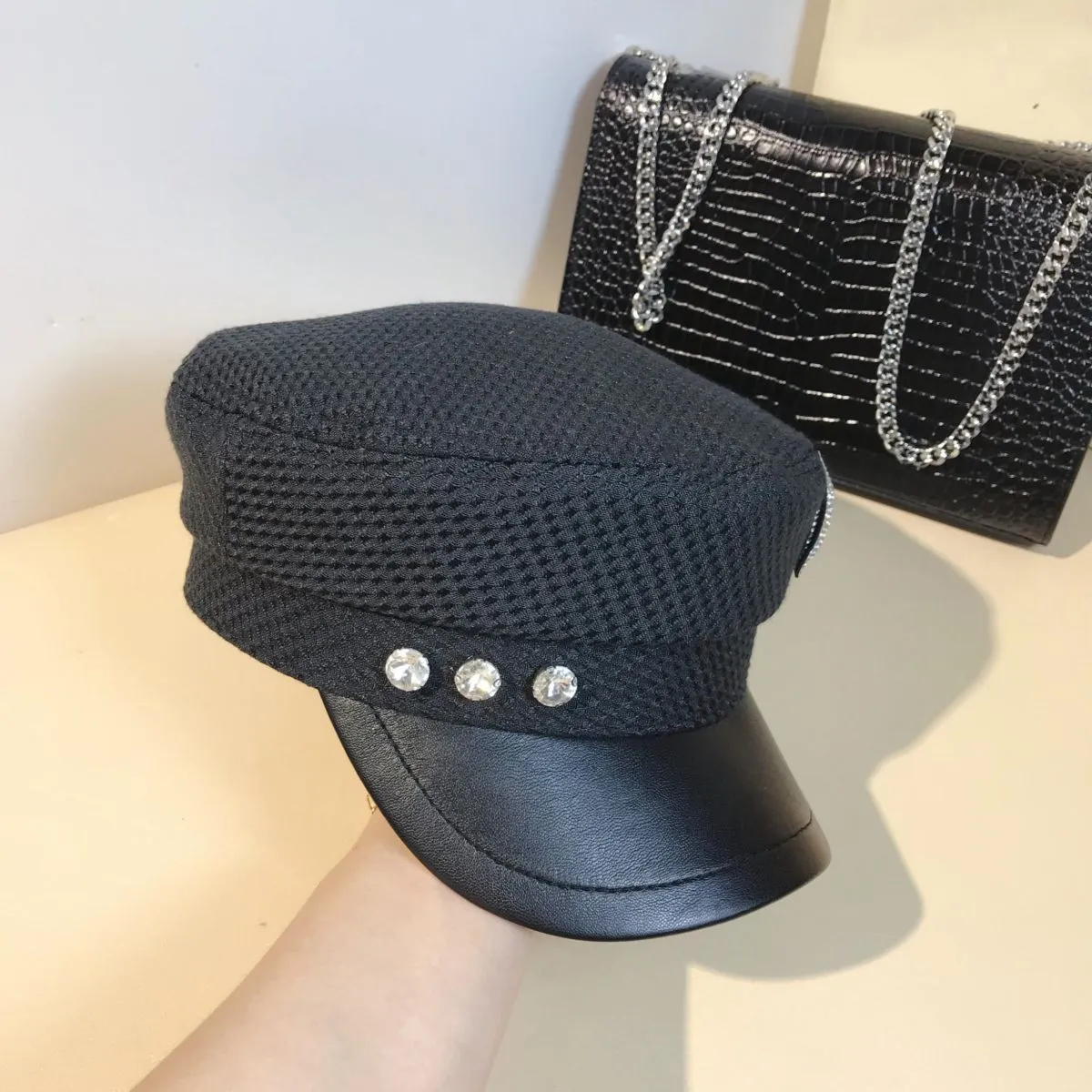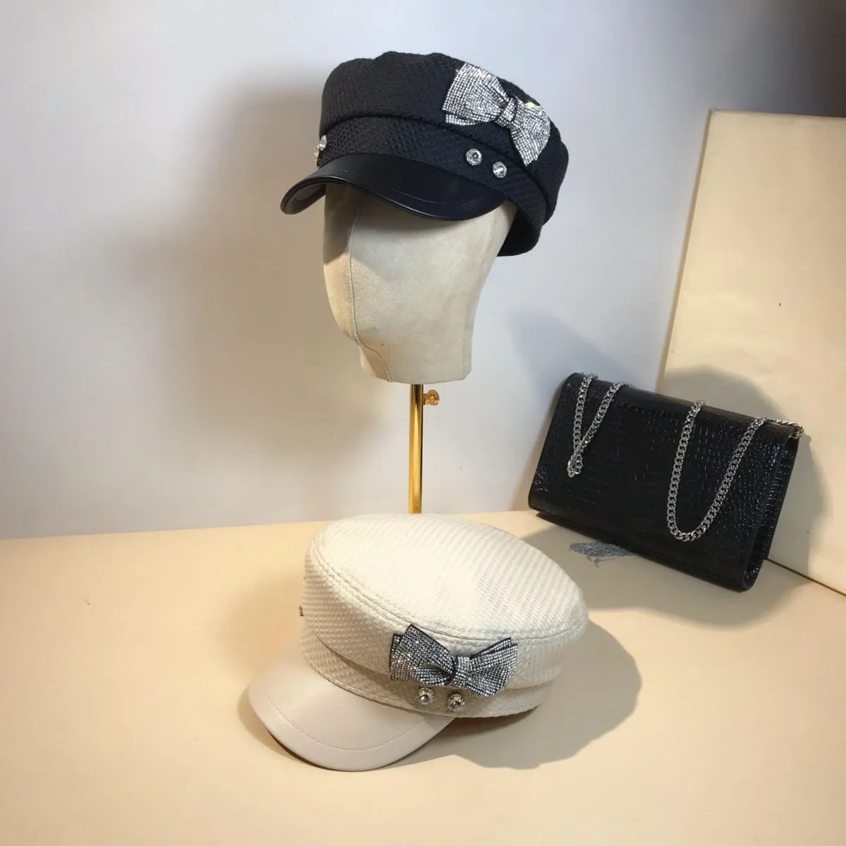 Splicing Socialite Flat Top Rhinestone Bow Navy Hat Female