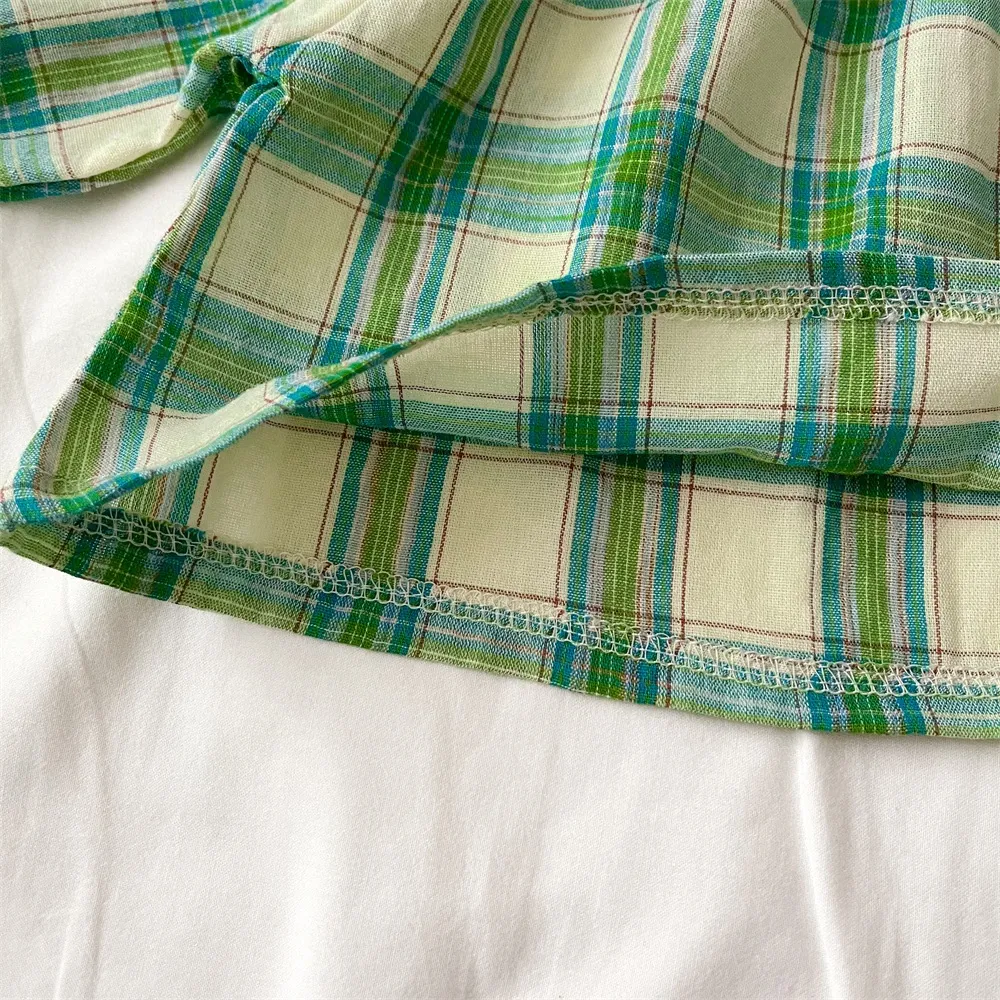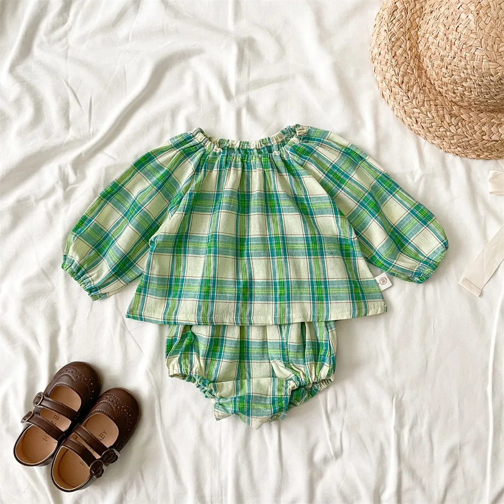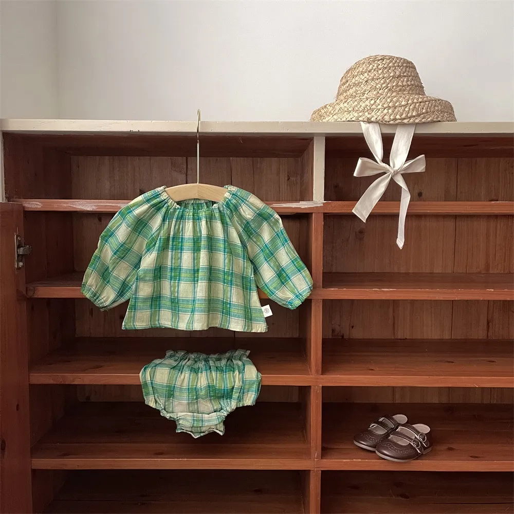 Spring And Autumn Baby Green Plaid Long Sleeve Shorts Suit