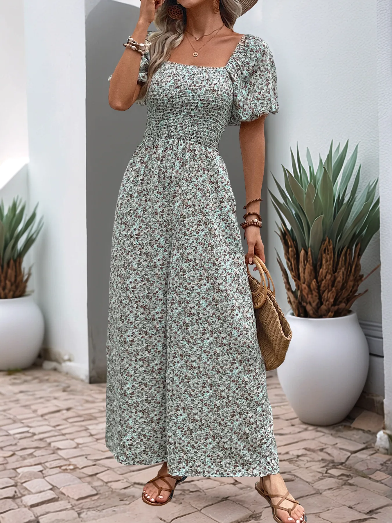 SEO Keywords: floral jumpsuit, vacation jumpsuit, puff sleeve jumpsuit, square collar jumpsuit, summer floral jumpsuit, trendy vacation jumpsuit, women’s floral outfit, stylish summer jumpsuit, comfortable jumpsuit, summer vacation jumpsuit.