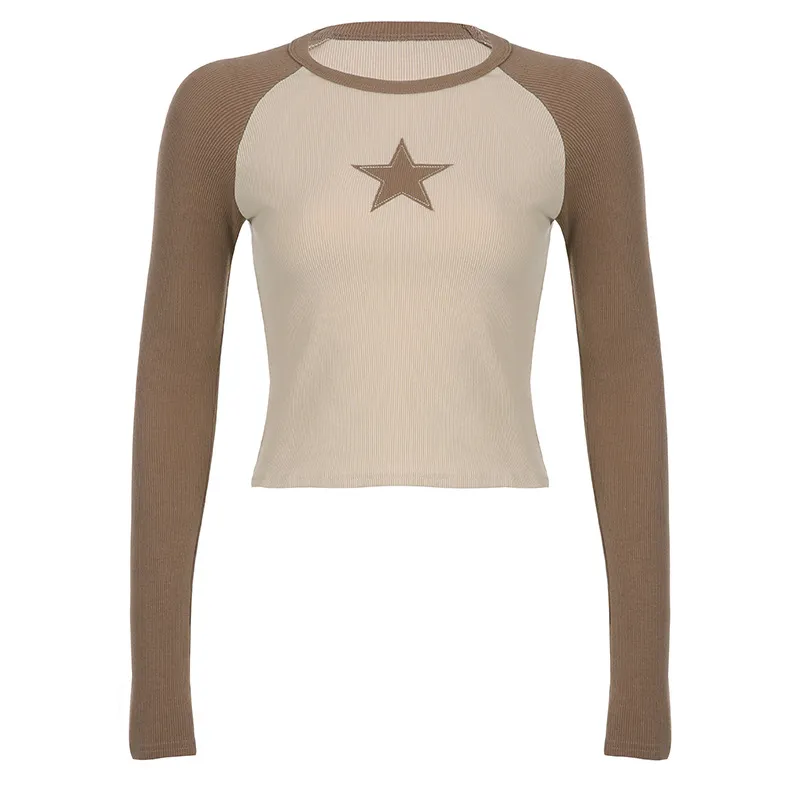 Stars Patchwork Long Sleeve T-shirts Women Slim Tops