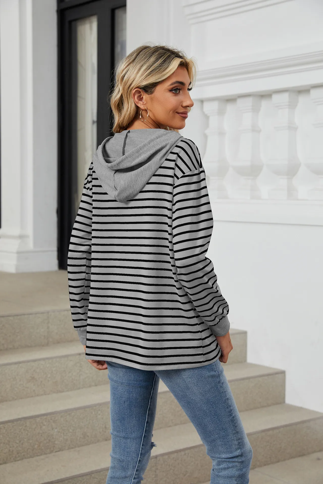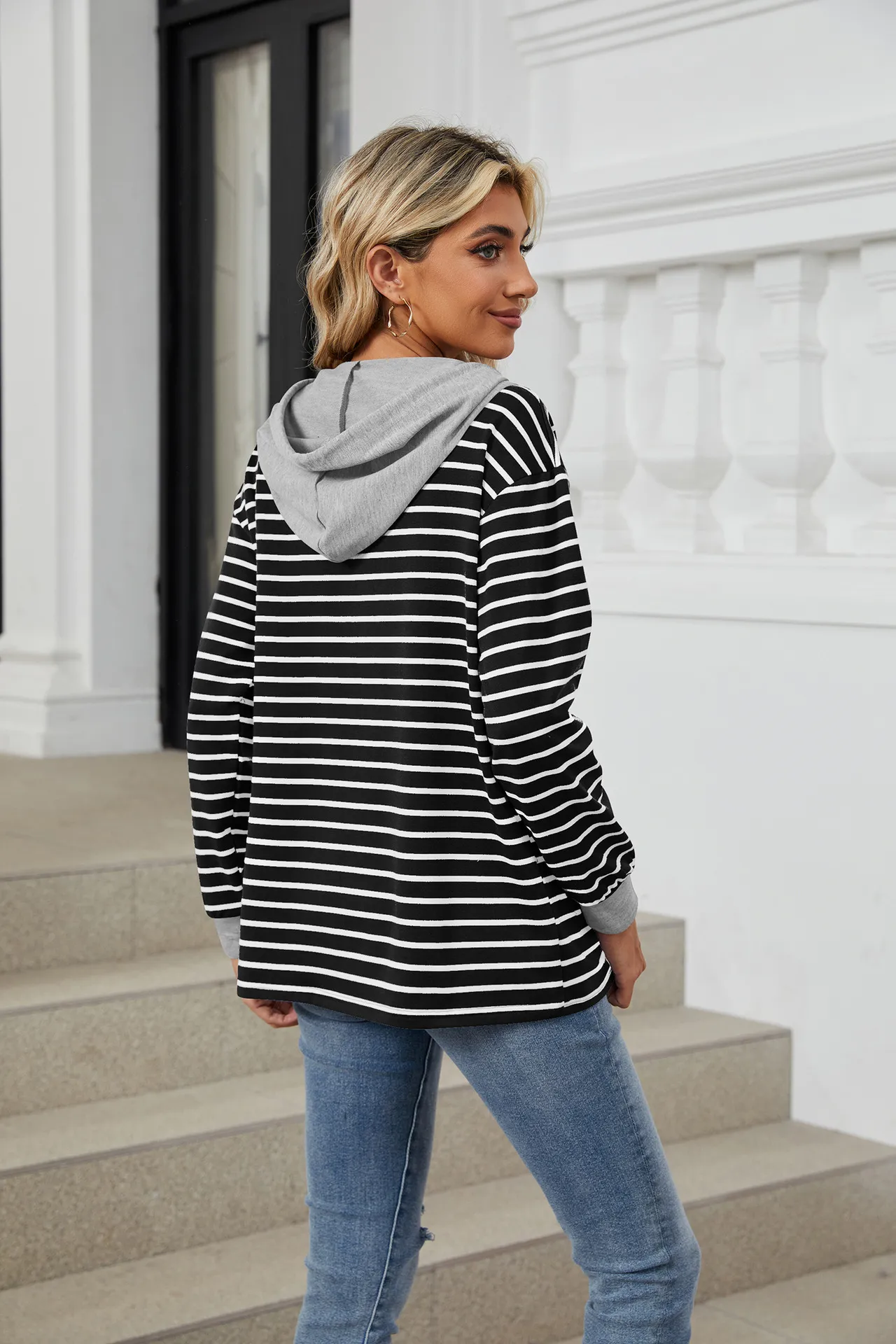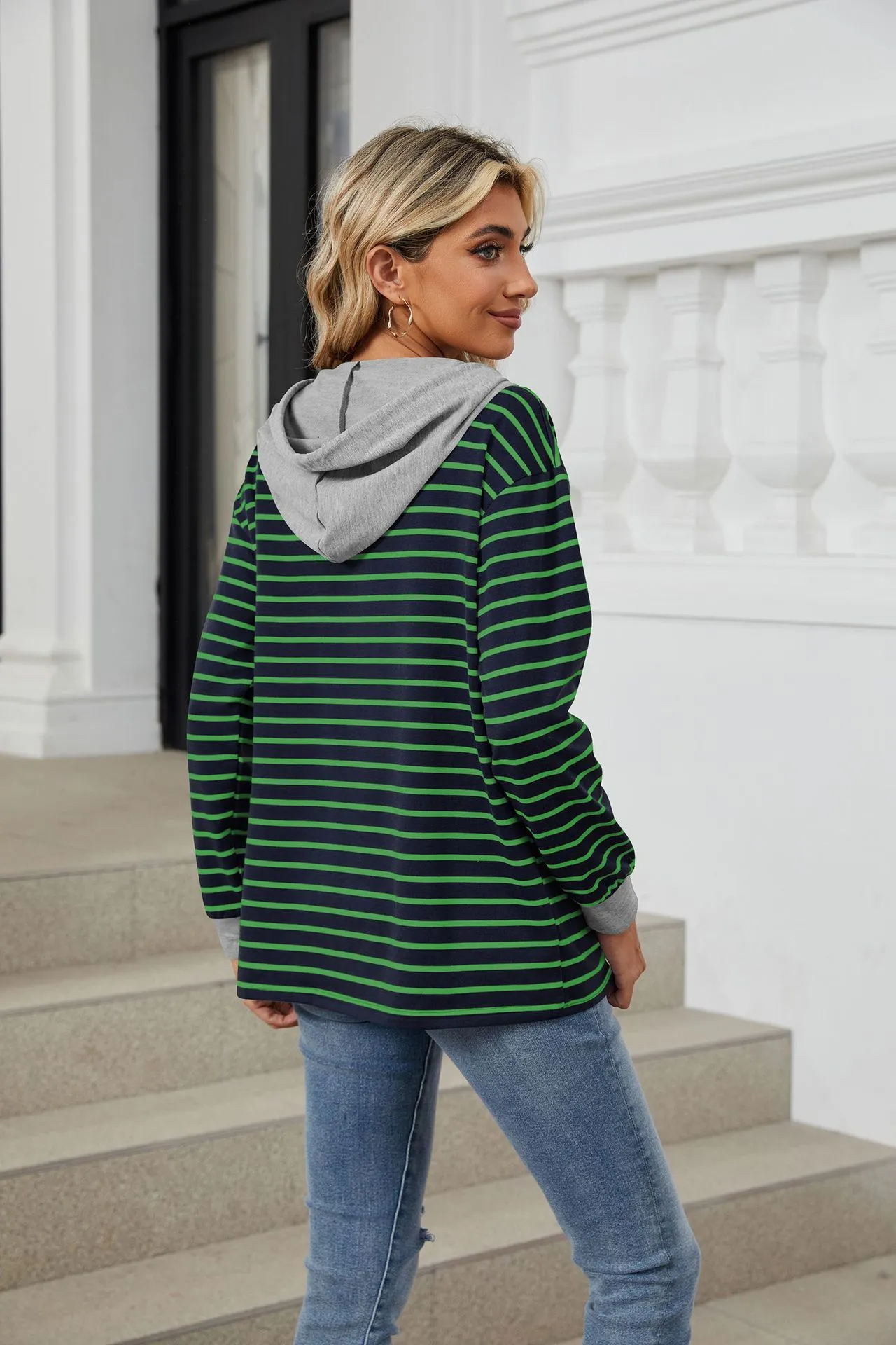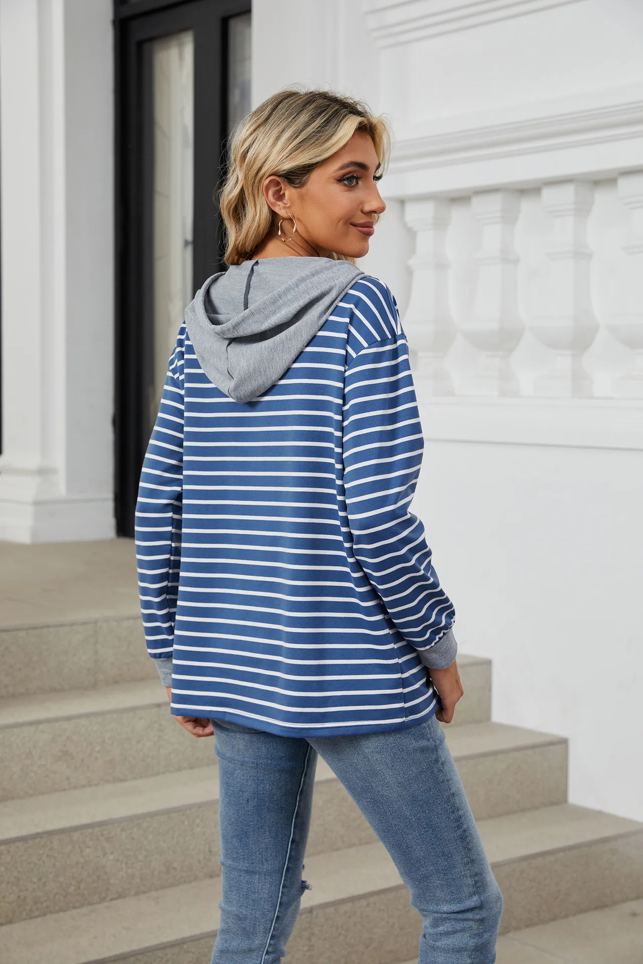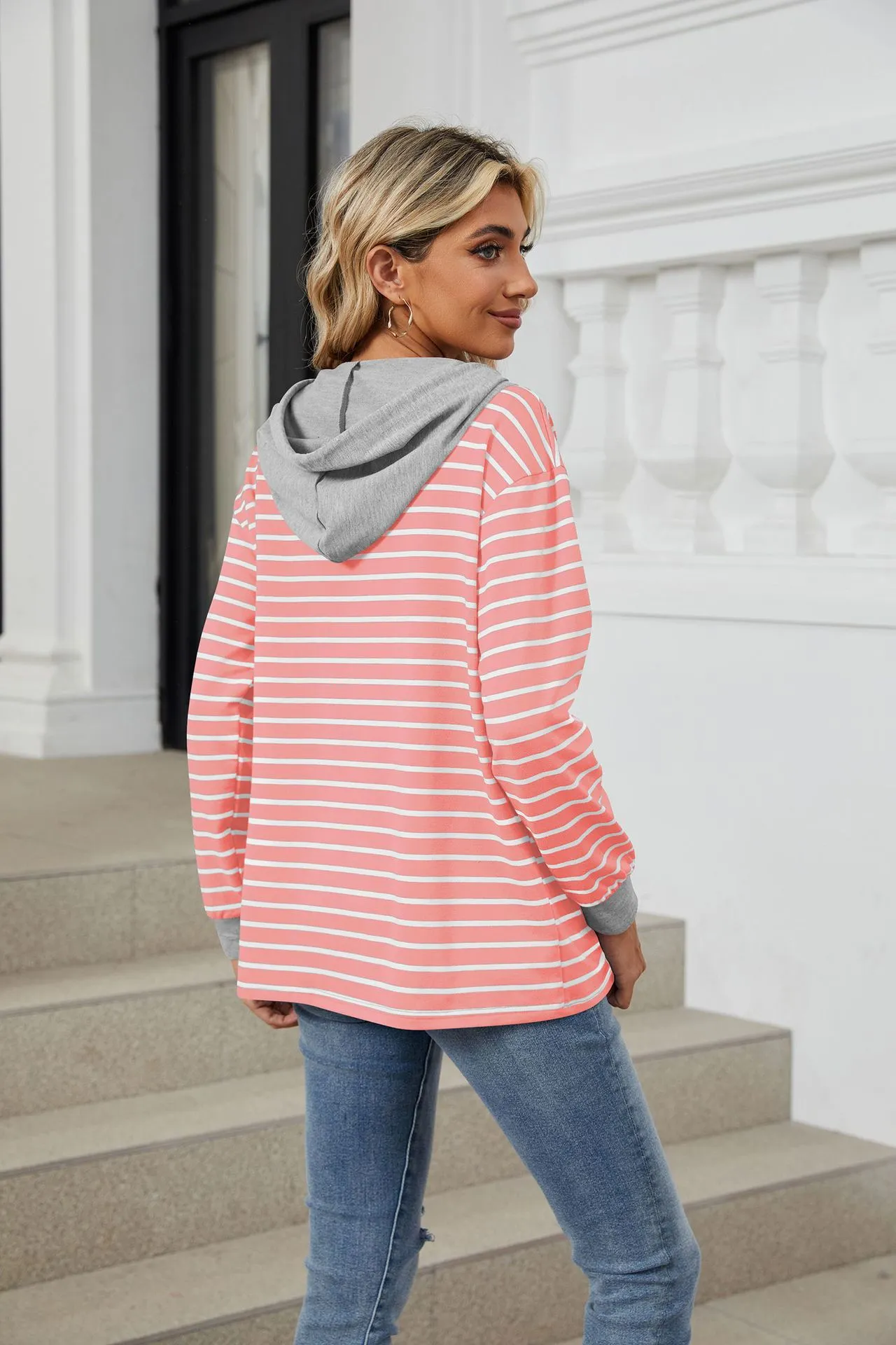 Striped Color Contrast Patchwork Hooded Long Sleeve Loose Sweatshirt Women