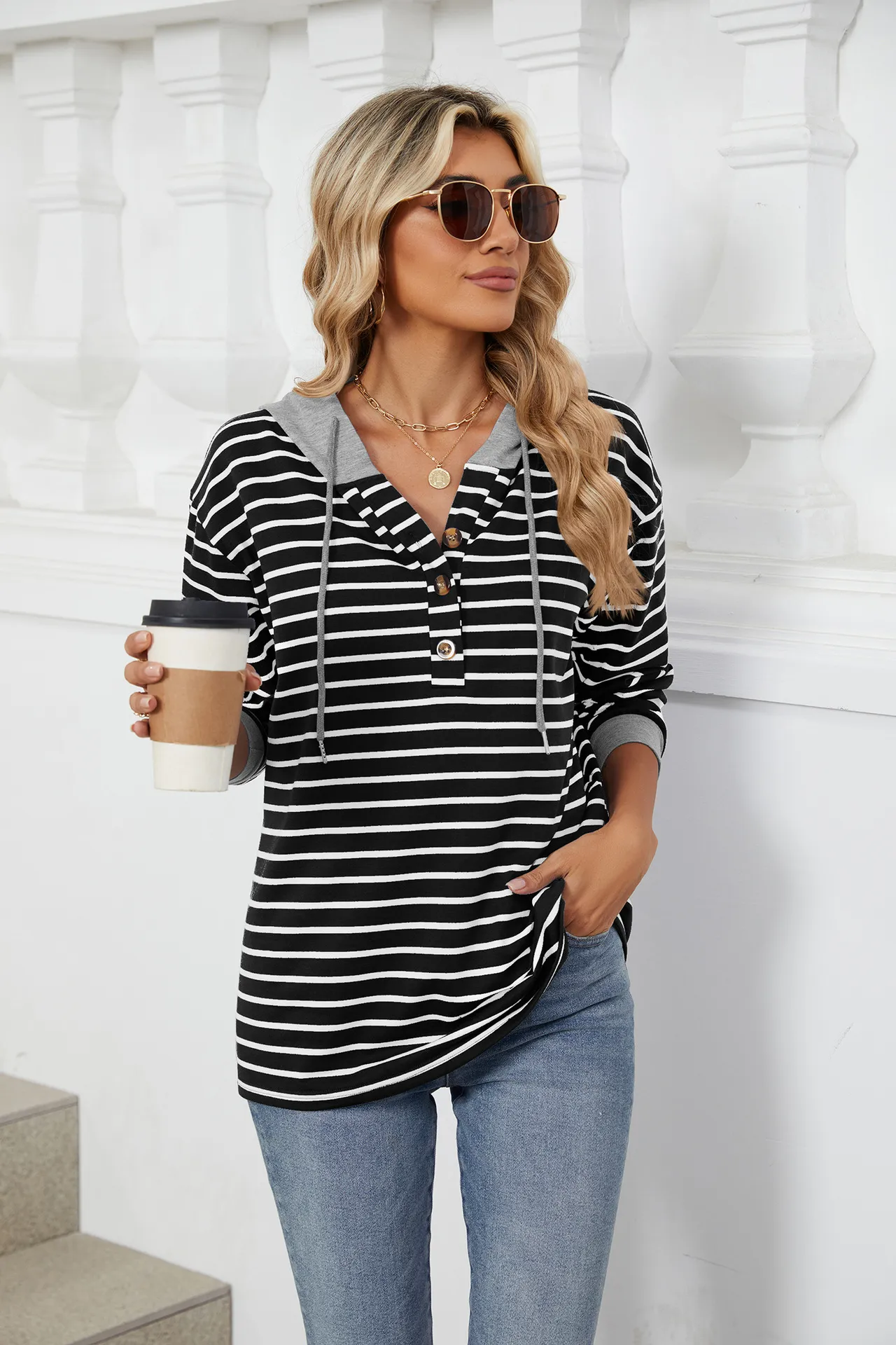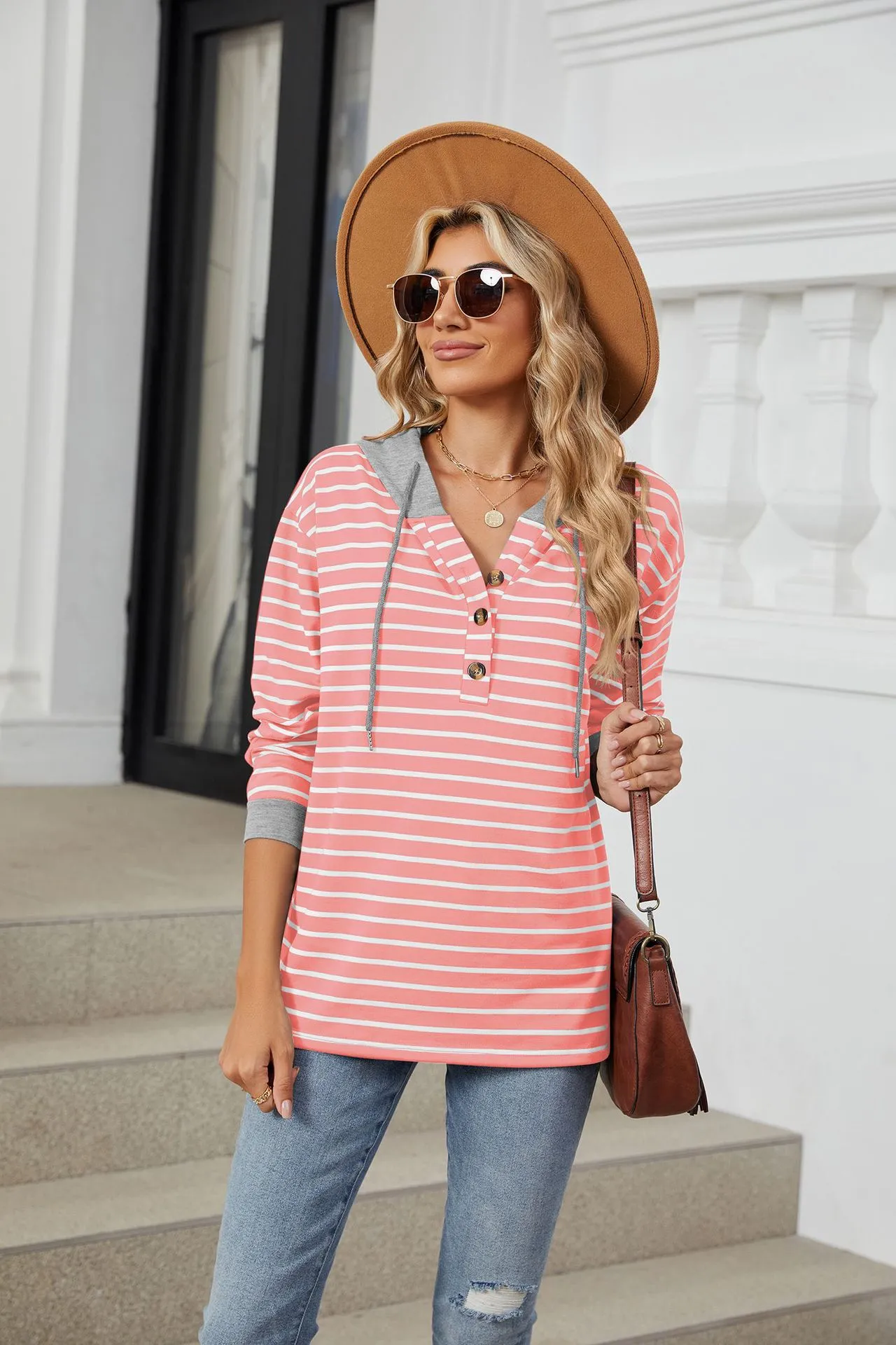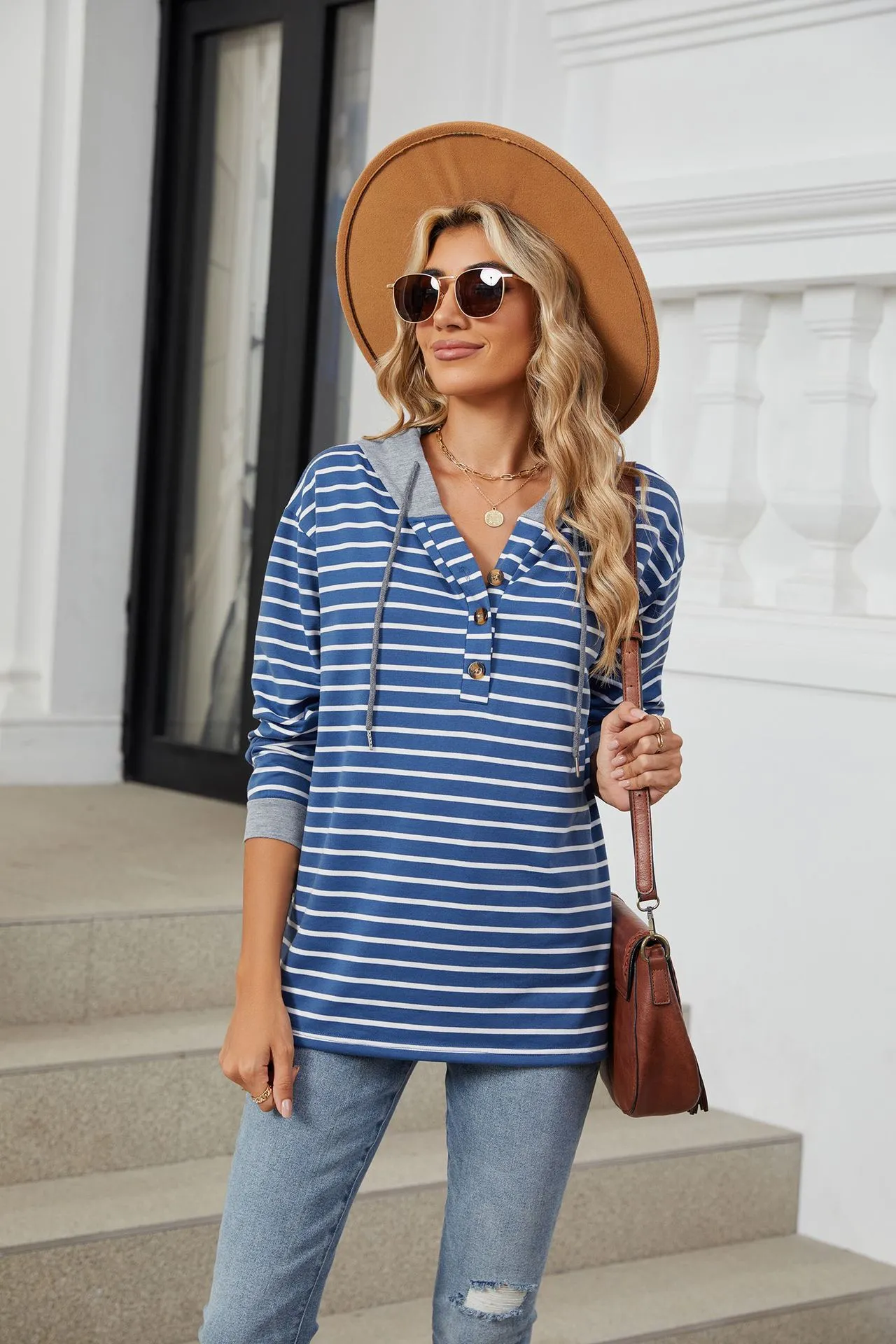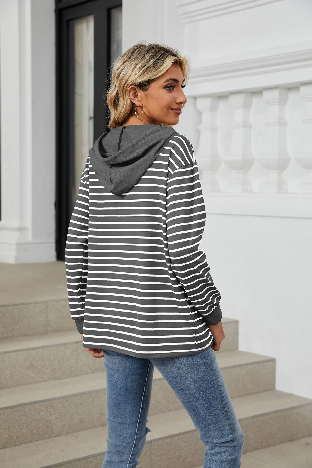 Striped Color Contrast Patchwork Hooded Long Sleeve Loose Sweatshirt Women