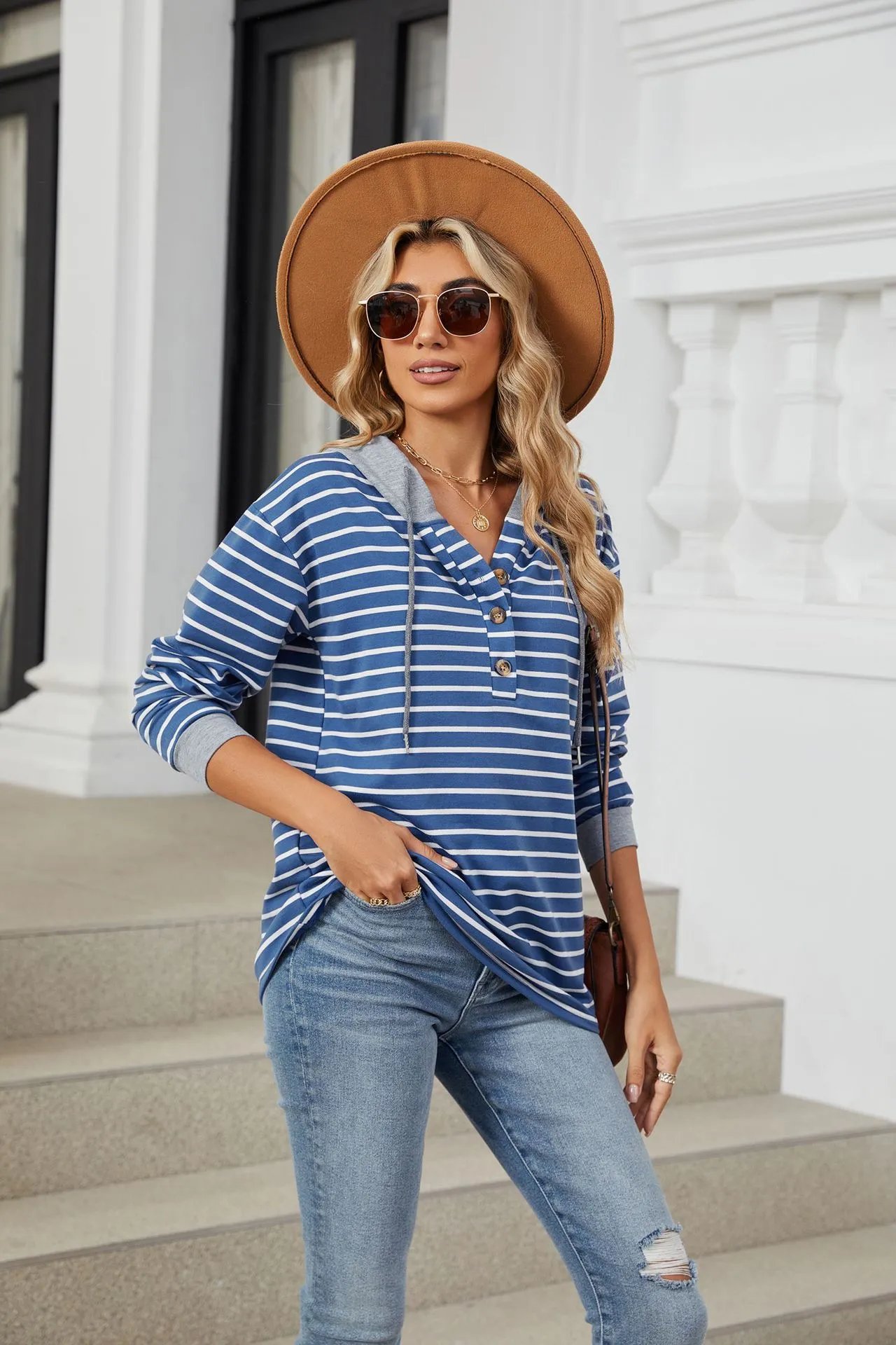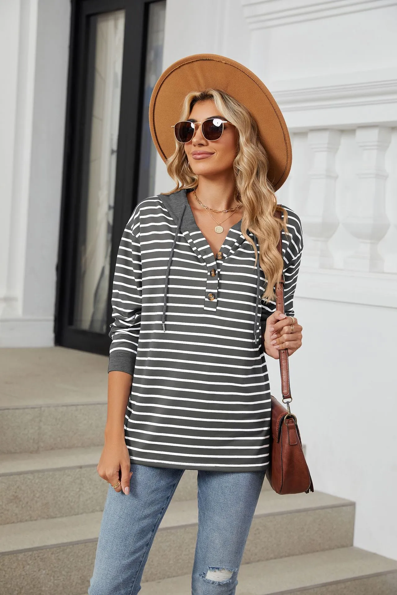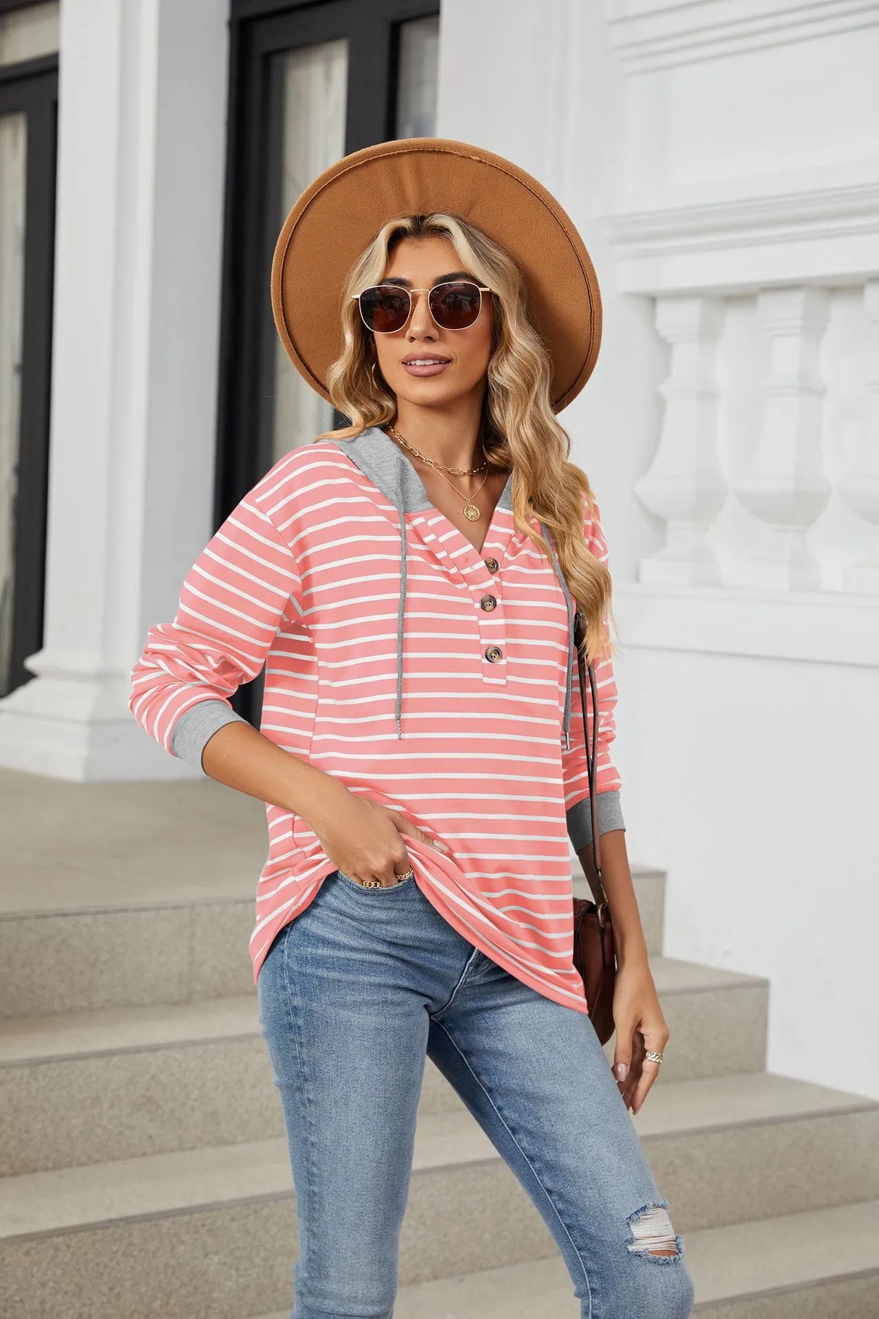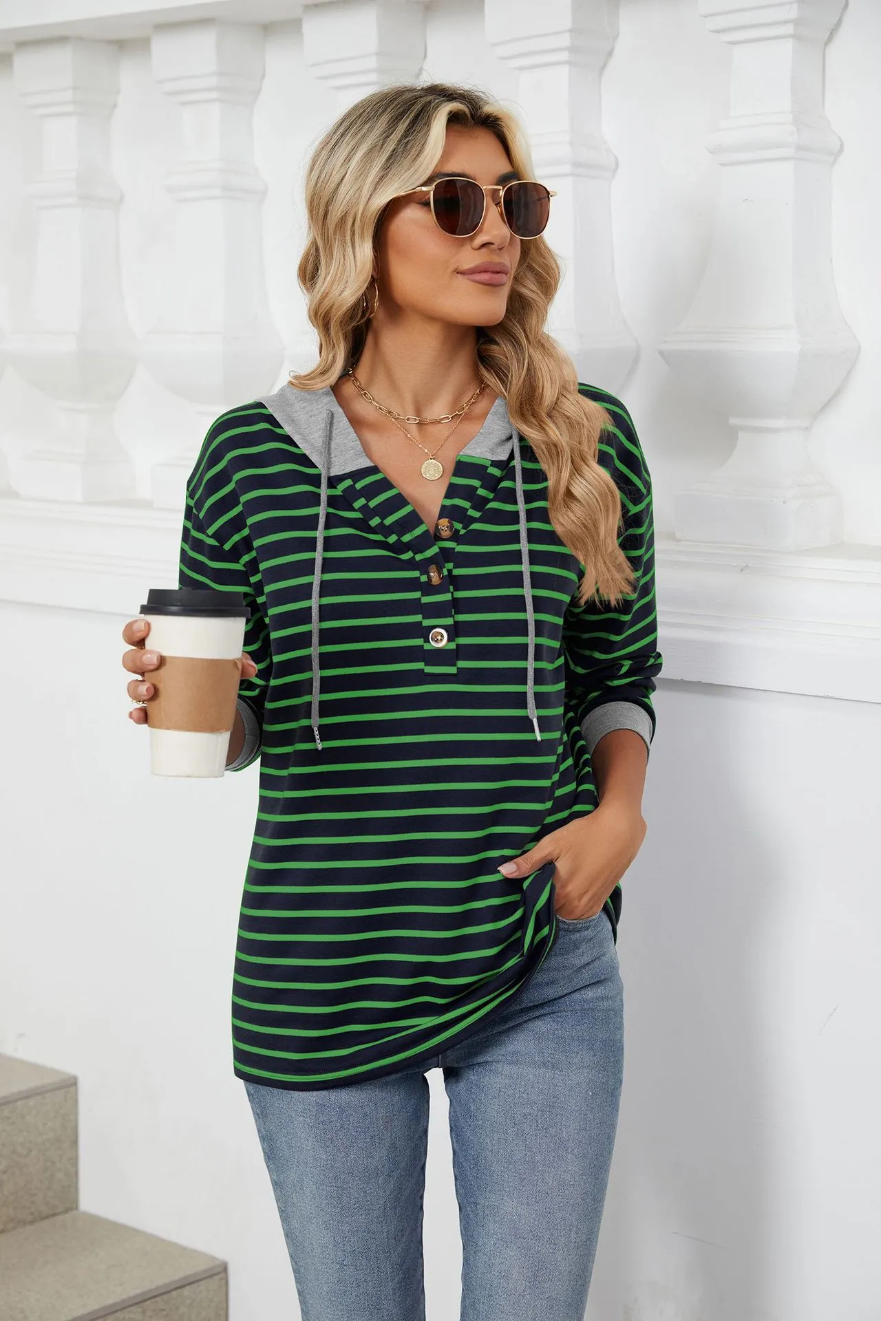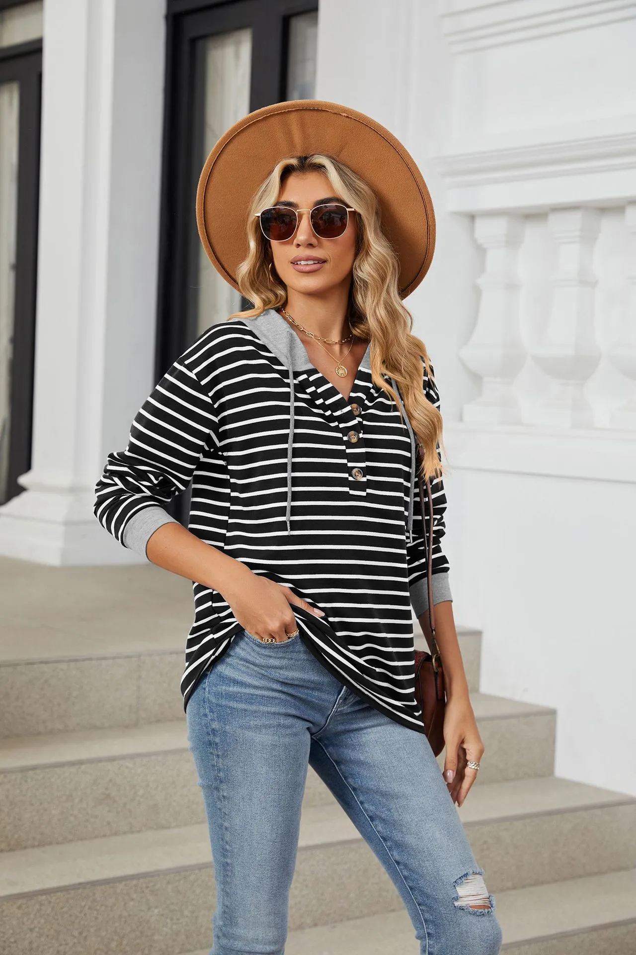 Striped Color Contrast Patchwork Hooded Long Sleeve Loose Sweatshirt Women