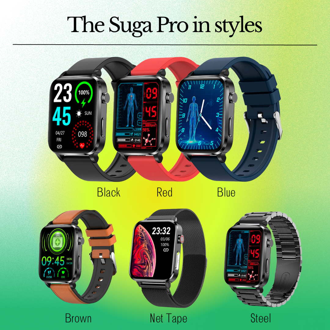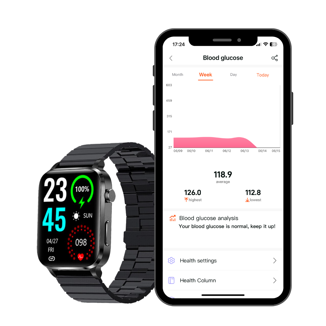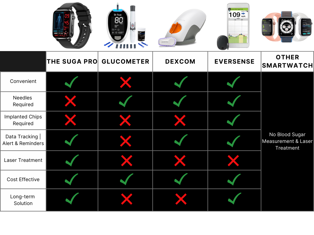 Taking advantage of the technology, The Sugaâ„¢ Smartwatch eliminates the need for finger pricks by using non-invasive technology to measure blood sugar levels by shining a 650nm wavelength laser light from the bottom of the device into your skin to measure the amount of light that is reflected back. The reflection allows the watch to calculate your blood sugar levels using a special mathematical equation called an algorithm. Simply wear the watch on your wrist and forget it!