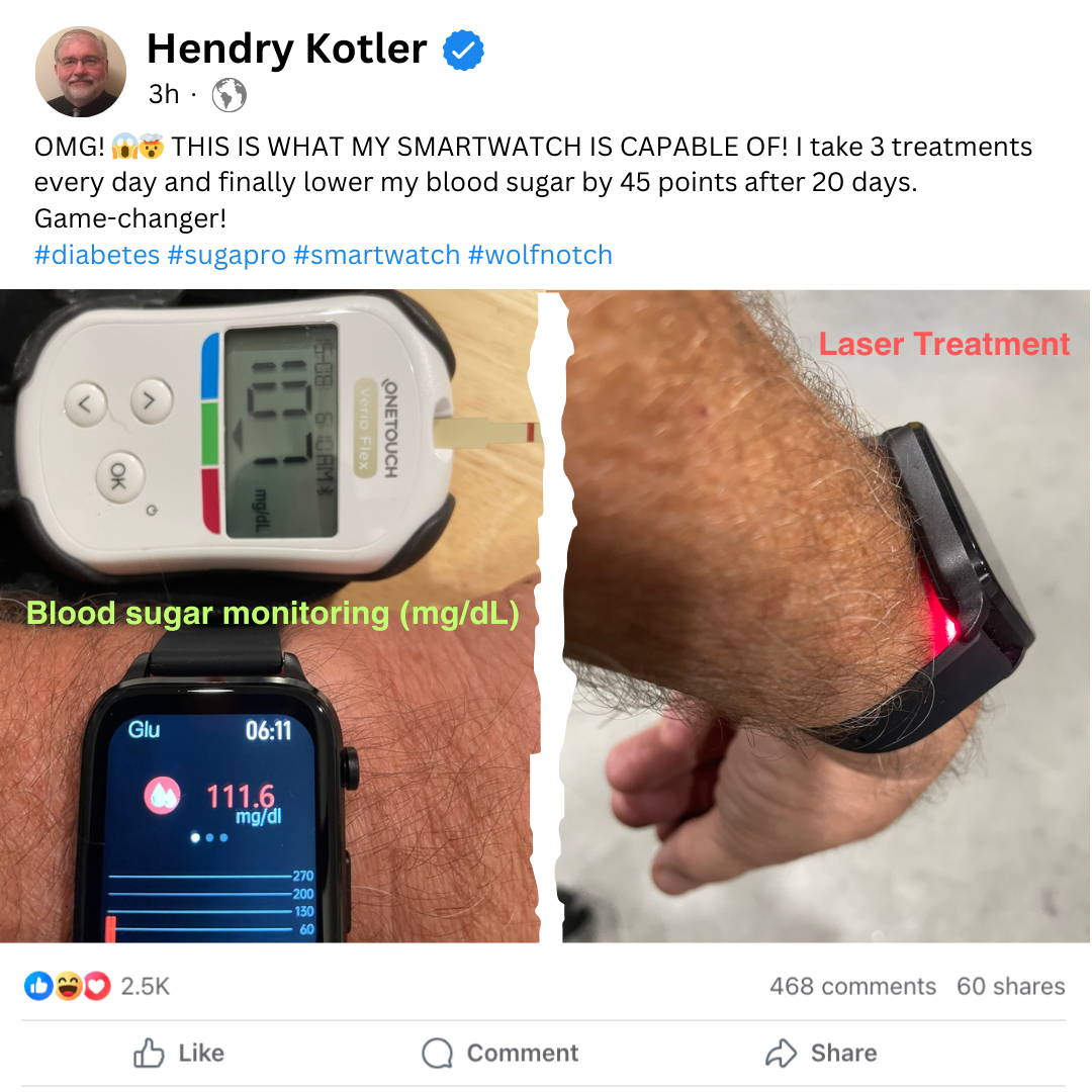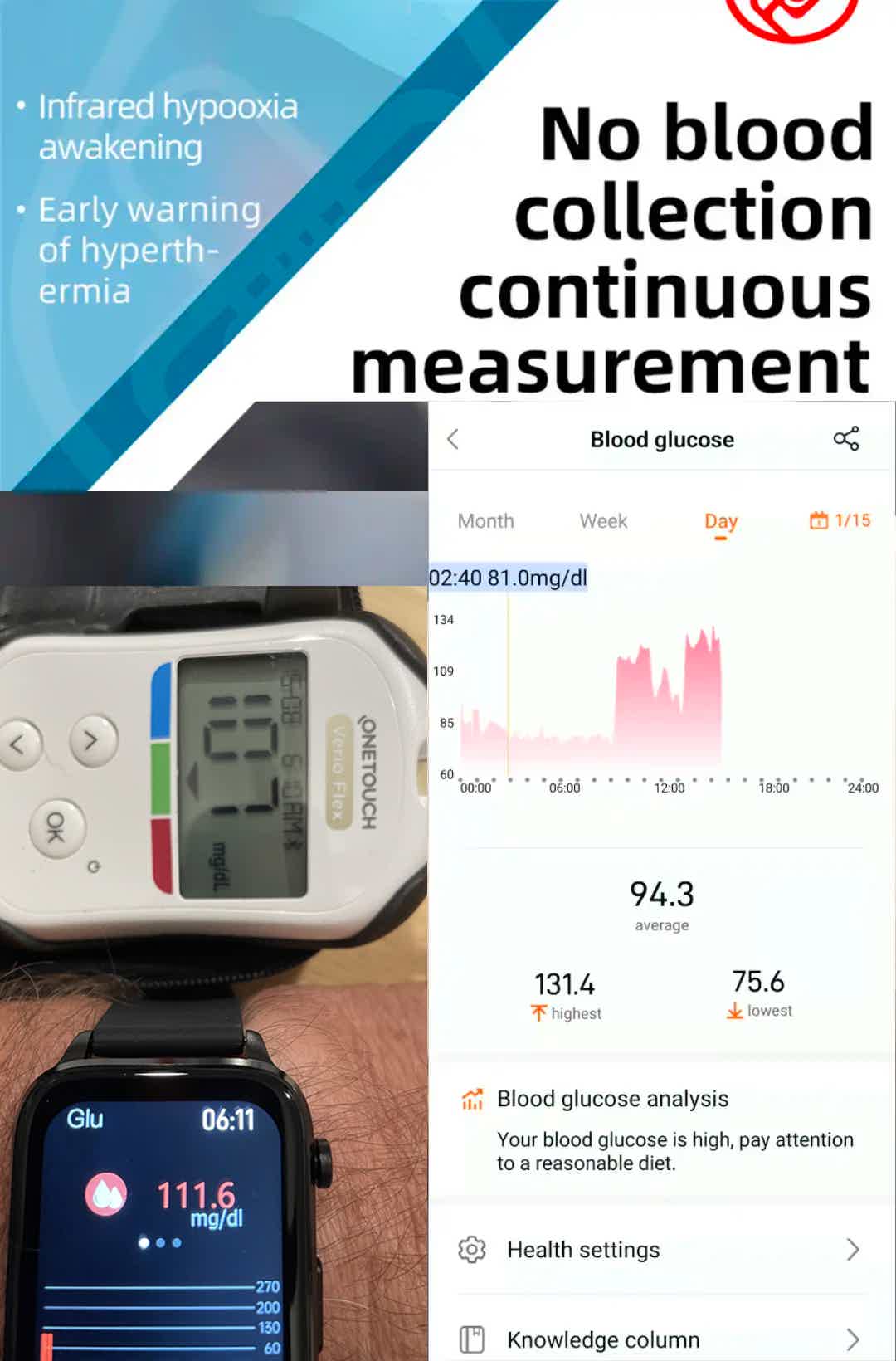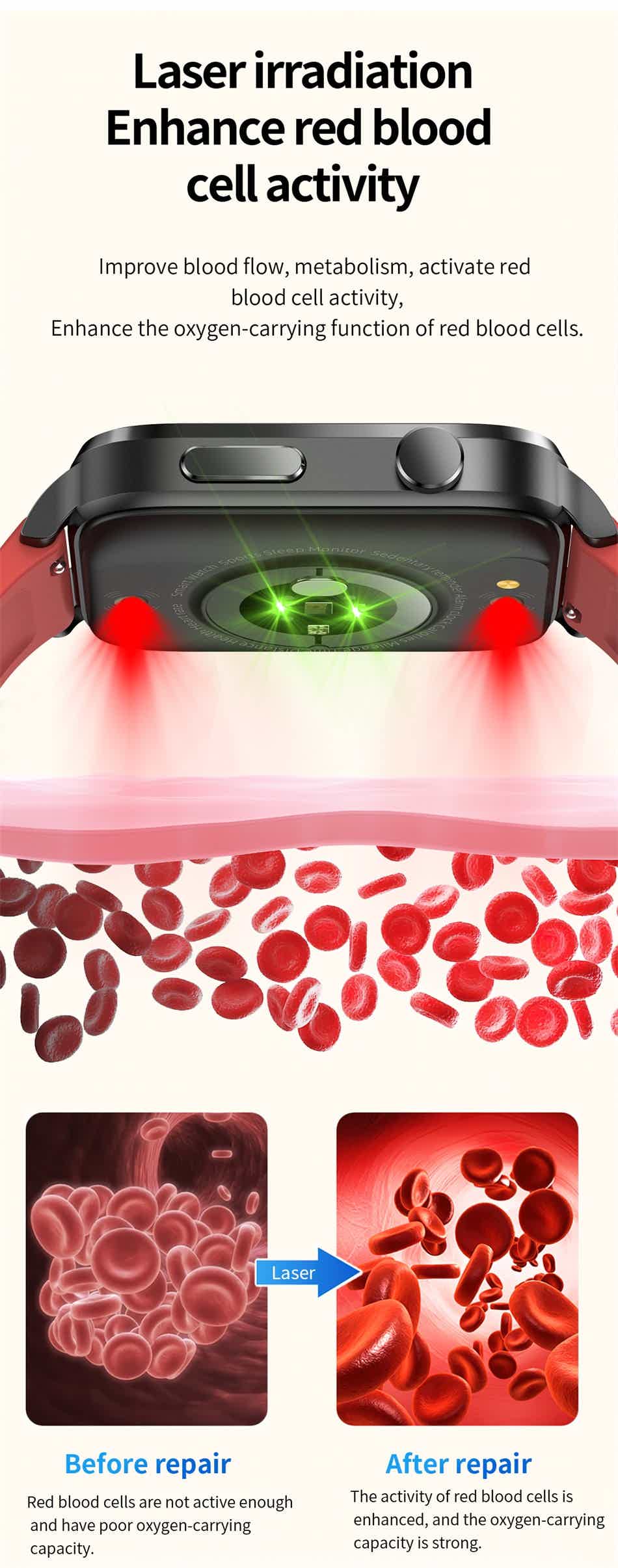 Taking advantage of the technology, The Sugaâ„¢ Smartwatch eliminates the need for finger pricks by using non-invasive technology to measure blood sugar levels by shining a 650nm wavelength laser light from the bottom of the device into your skin to measure the amount of light that is reflected back. The reflection allows the watch to calculate your blood sugar levels using a special mathematical equation called an algorithm. Simply wear the watch on your wrist and forget it!