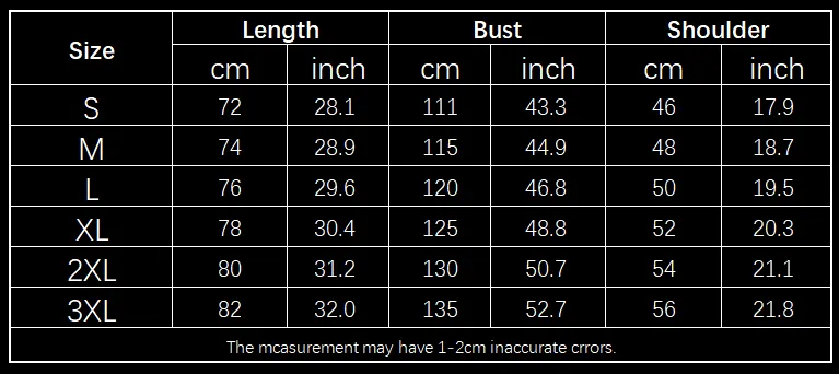 1. Asian sizes are 1 to 2 sizes smaller than European and American people. Choose the larger size if your size between two sizes. Please allow 2-3cm differences due to manual measurement.
