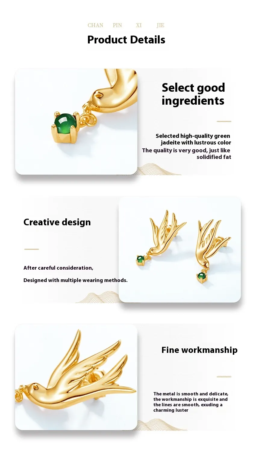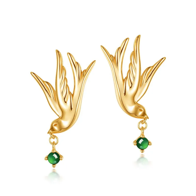 Swallow Earrings S925 Silver Plated Inlaid Green Jade Earrings