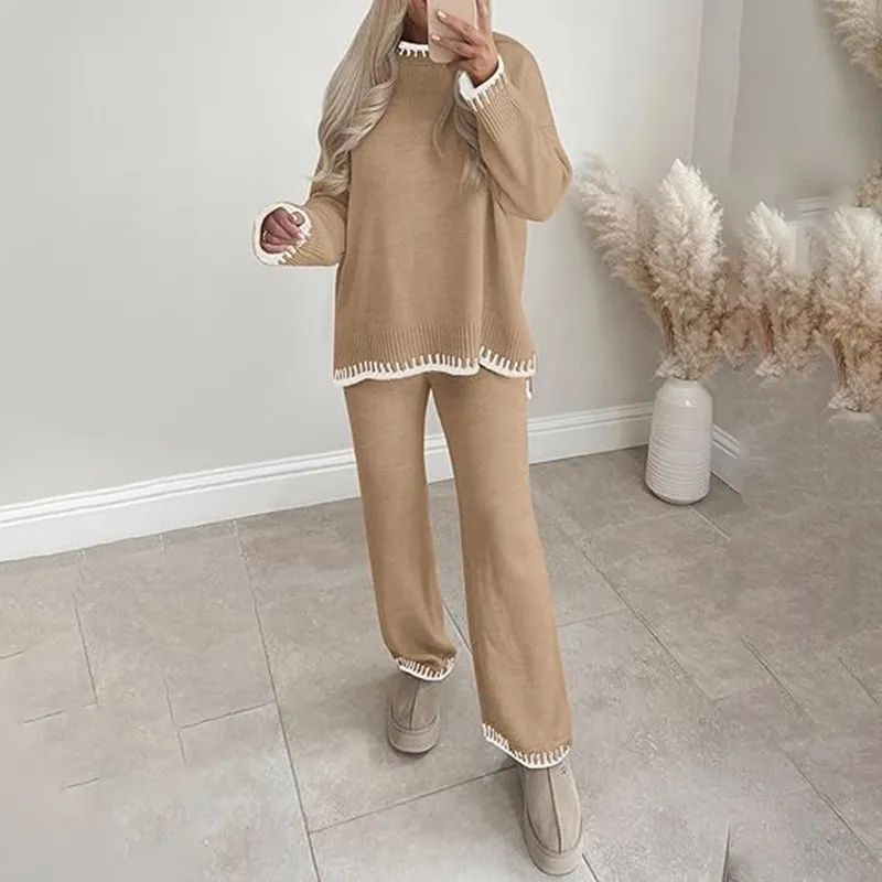 Sweater Knit Casual Long Sleeve Pullover Wide Leg Pants Suit