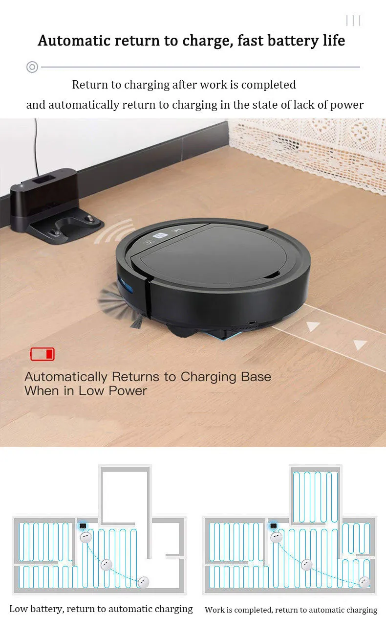 Automatic Recharge: When the battery is low, the vacuum will automatically return to the charging dock for recharging.