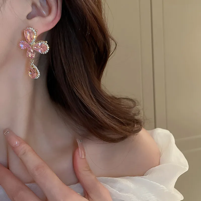 Sweet Light Luxury Rhinestone Zircon Butterfly Water Drop Silver Pin Earrings