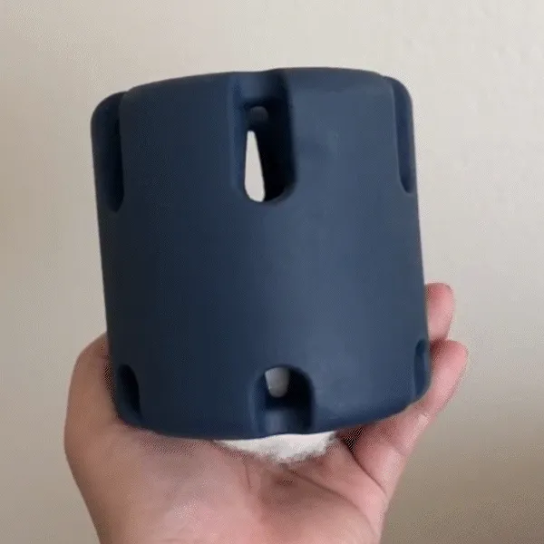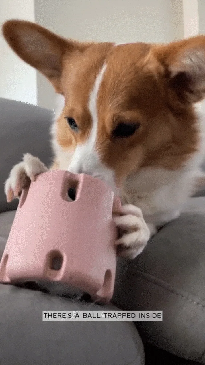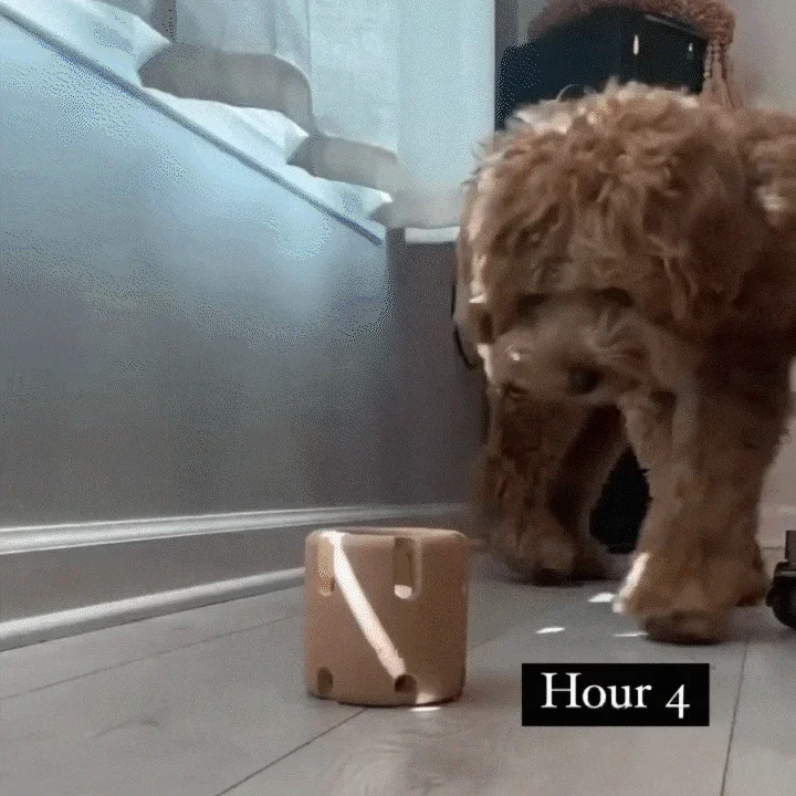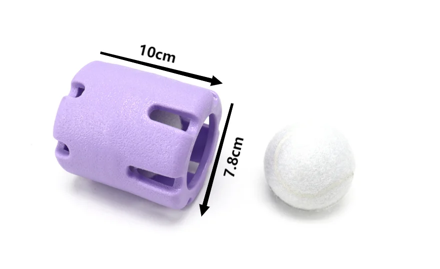 tough for pups to retrieve. The cylinder shape makes it perfect for rolling and paw pushing, while the slatted walls