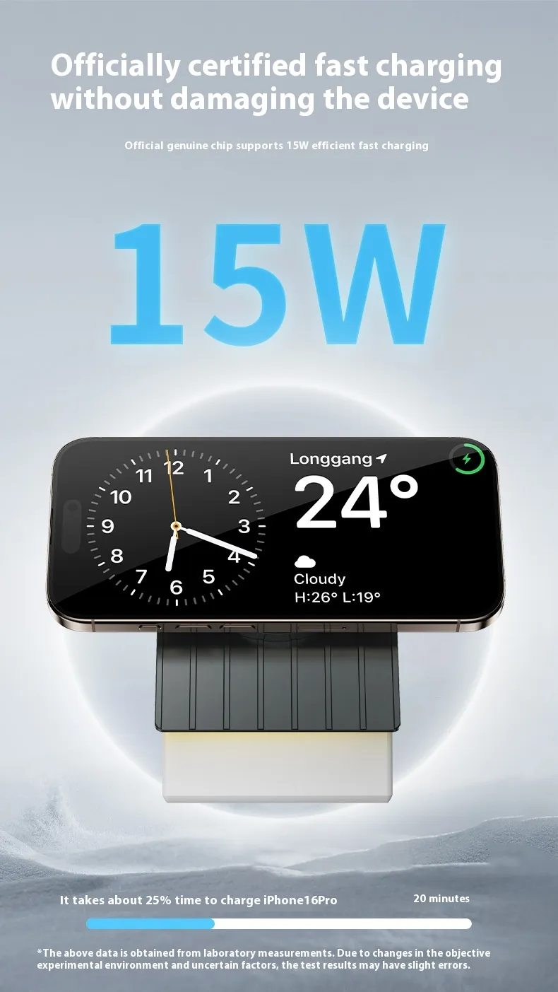 Equipped with a magnetic alignment system, this charger securely holds your phone in place, ensuring a hassle-free charging experience. The desktop base is compact yet stable, preventing slips or tilts while keeping your workspace neat.