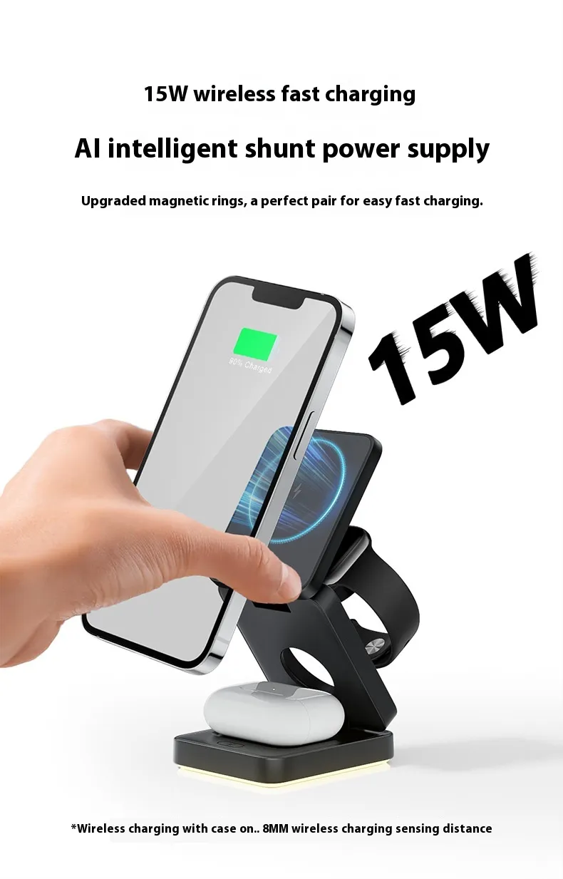 The Three-in-One Wireless Charger Folding Magnetic Wireless Charger is designed for users who want efficient, versatile, and convenient charging for multiple devices. Perfect for New Zealand households and offices, this charger supports simultaneous charging of smartphones, earbuds, and smartwatches, all in a foldable, space-saving design.