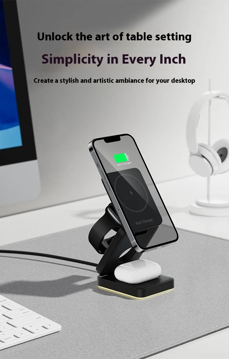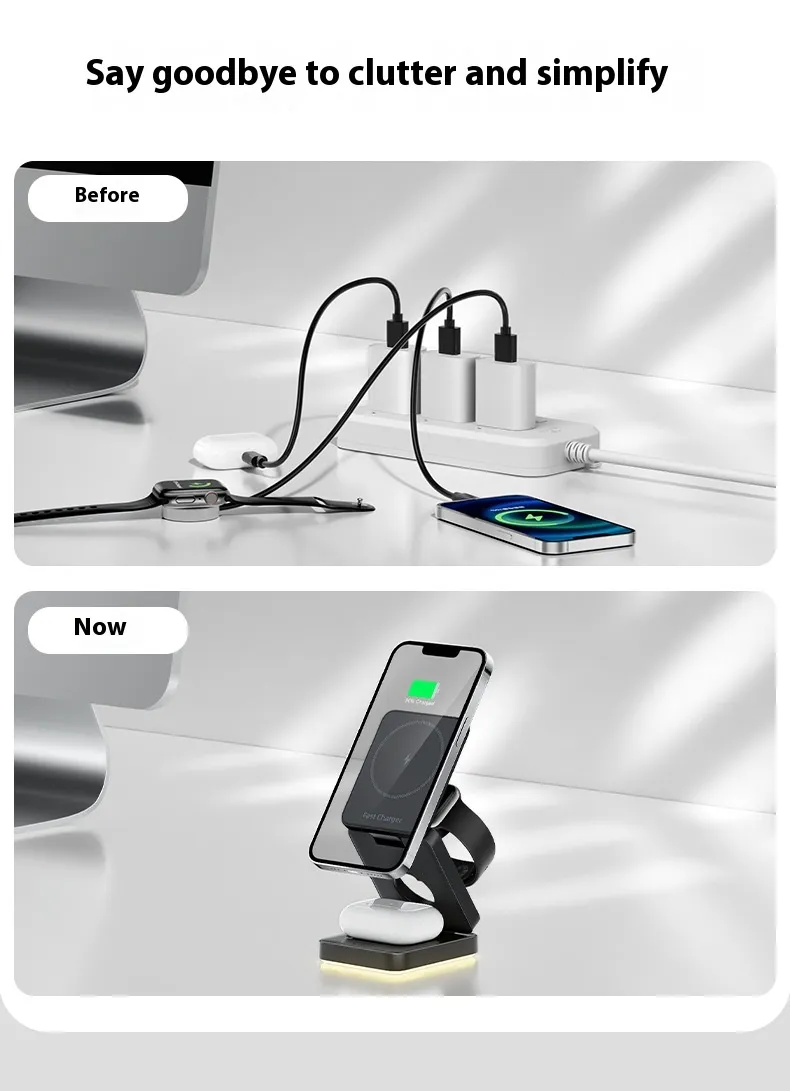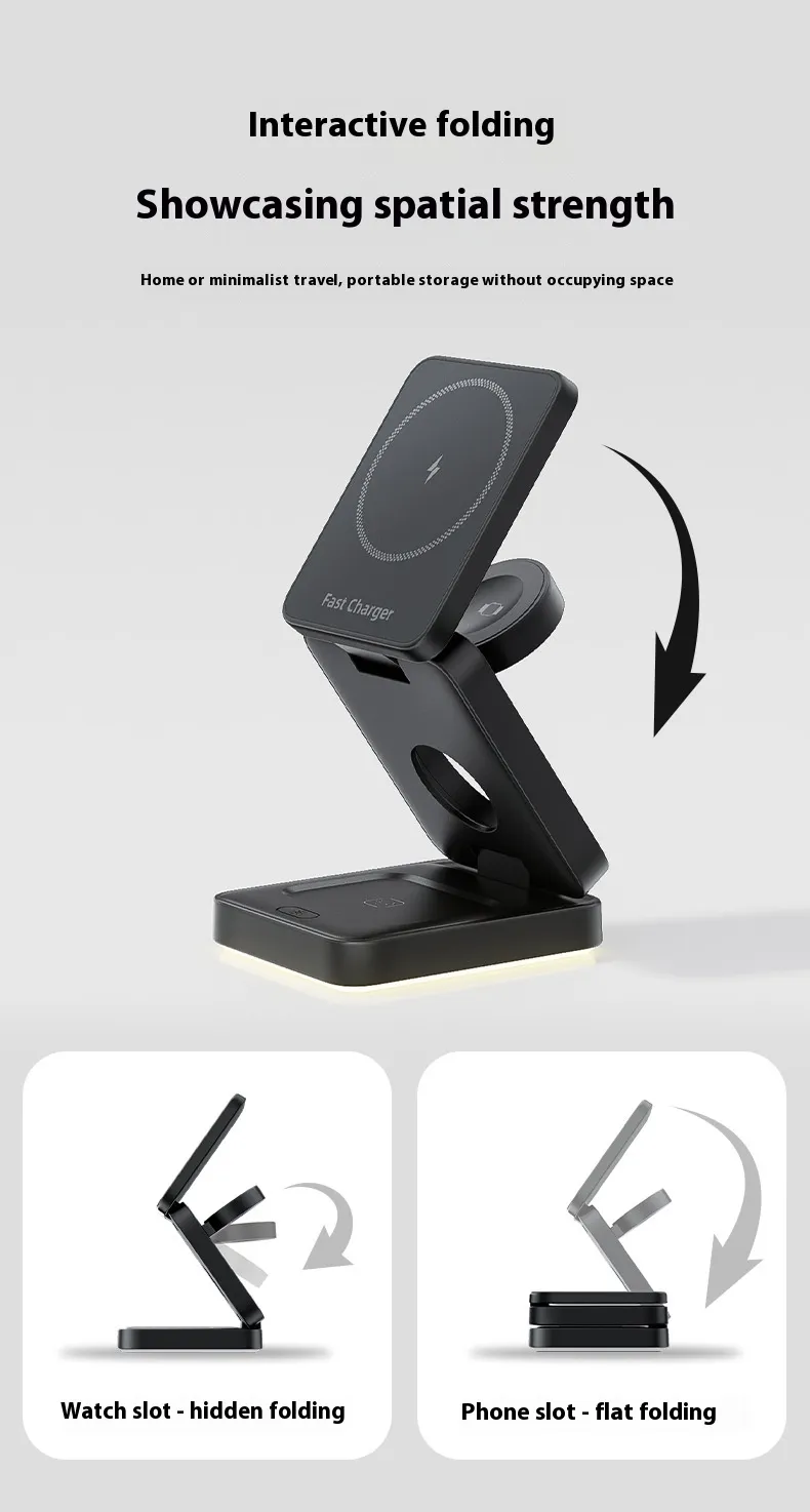 Whether at home, in the office, or on the go, the Three-in-One Folding Magnetic Wireless Charger provides a clean, efficient, and stylish solution for keeping all your devices powered. Its multifunctional design reduces clutter and ensures your essential electronics are always ready.