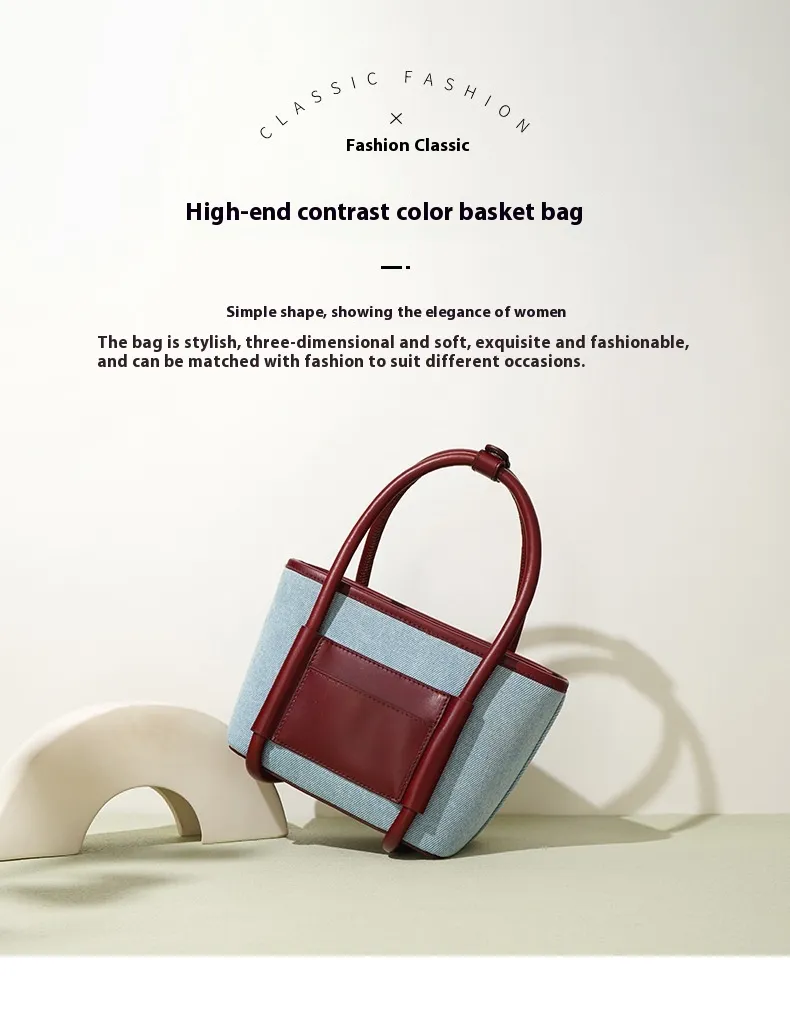 Top Layer Cowhide With Denim Cloth Vegetable Basket Bag Niche Splicing Single Shoulder Crossbody