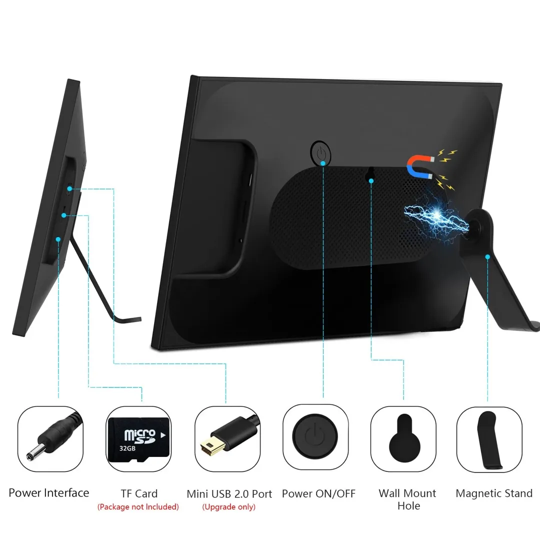 4. Portrait & Landscape & Auto Rotation & Wall-mountable: With a detachable solid rack as a frame stand, allowing you to view