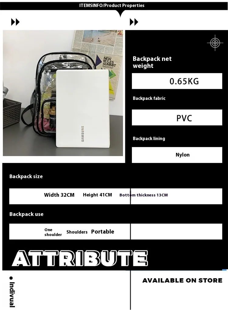 - Transparent PVC Material: The clear PVC construction provides durability and a modern, stylish look while allowing you to see the contents of your backpack at a glance.