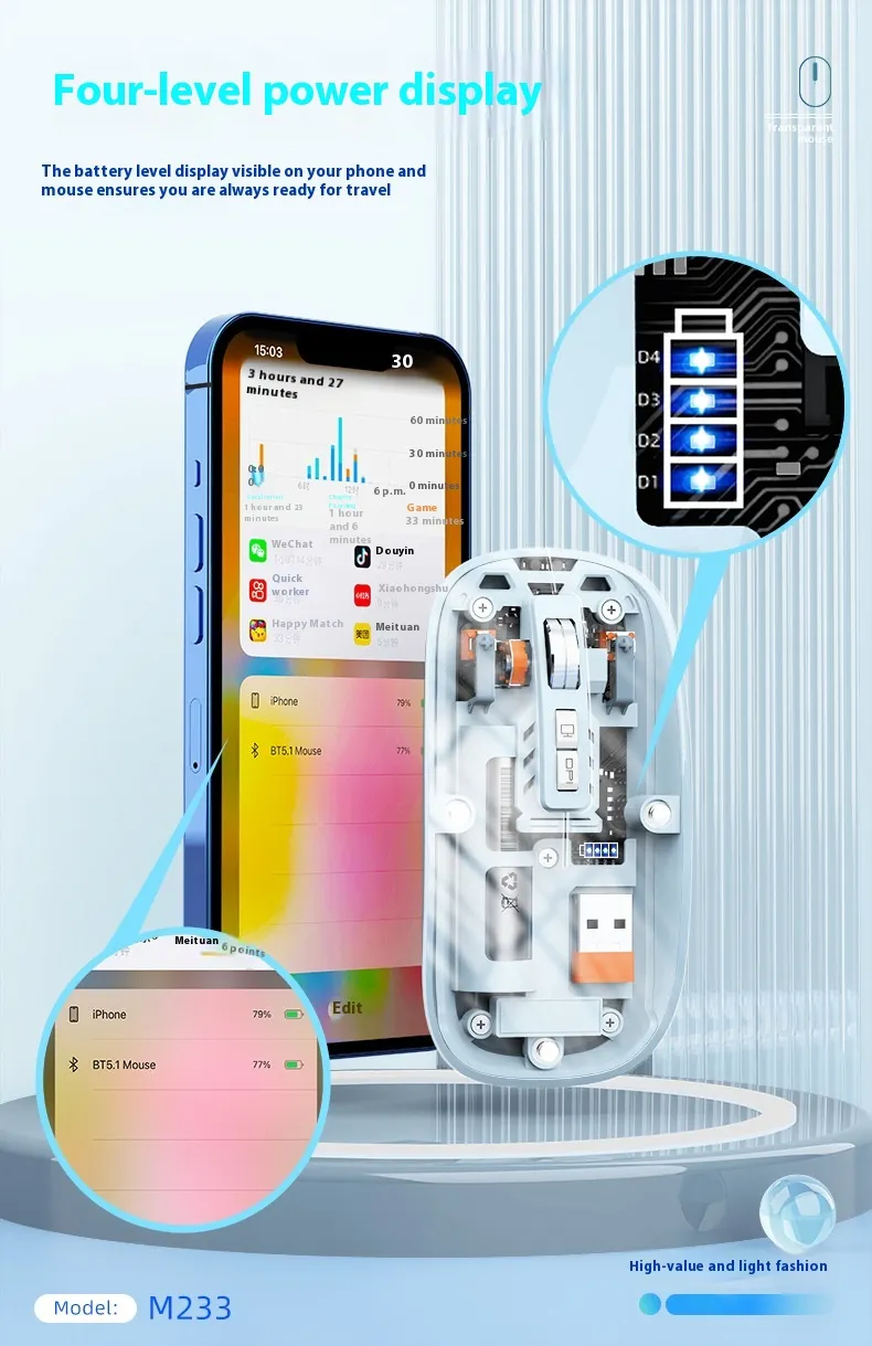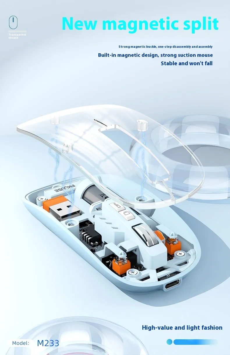 Enhance your workspace with the Transparent Wireless Mouse, combining style, functionality, and convenience for everyday use at home or in the office.