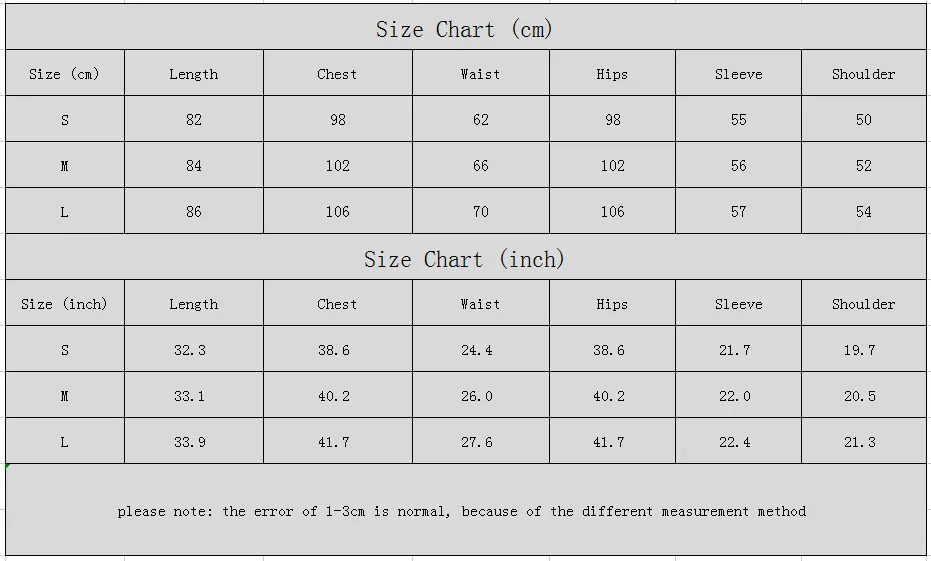 allow 2-3cm differences due to manual measurement.
